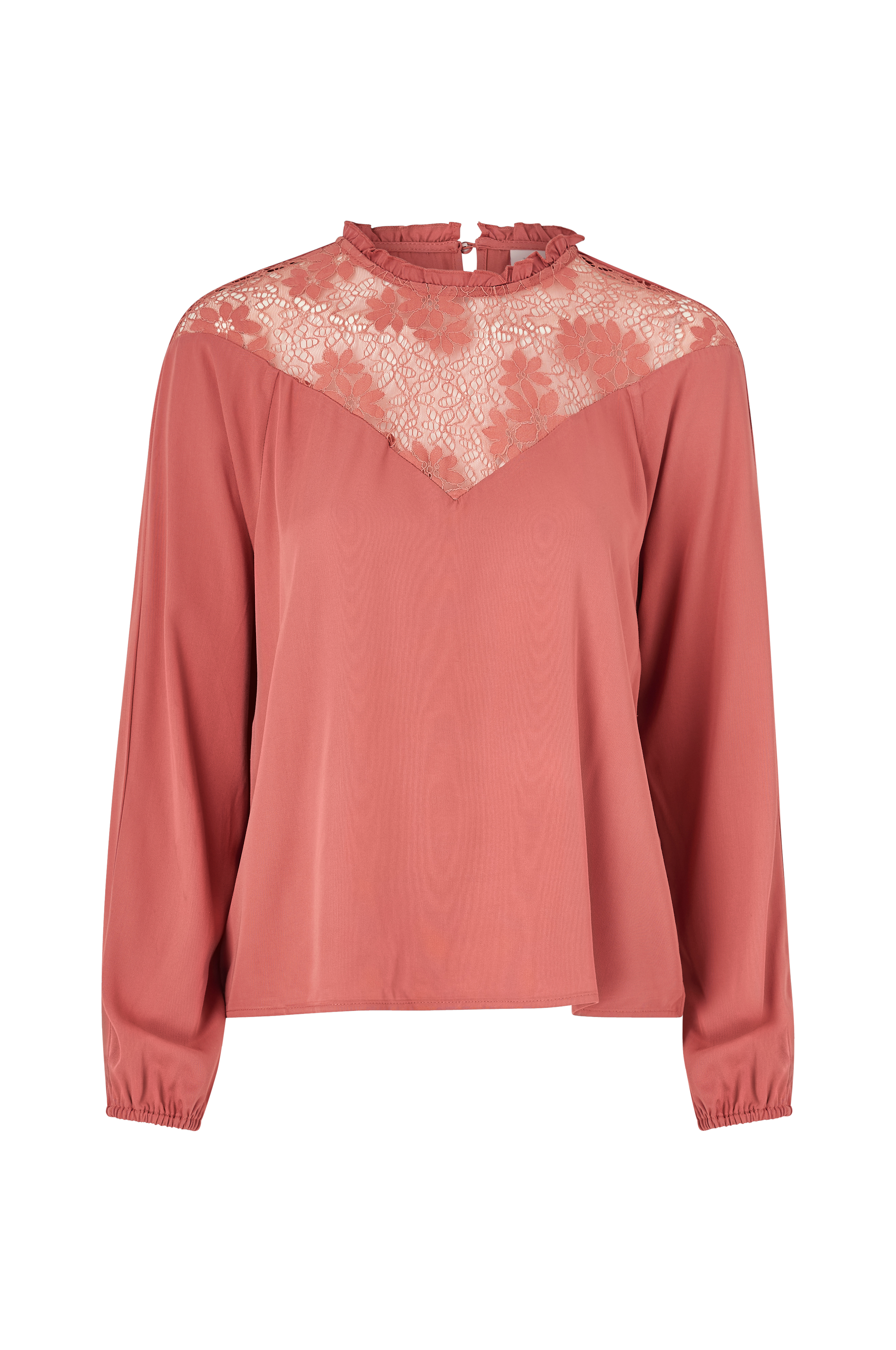 Topp viSuvita L/S Lace Top från Vila med parti i gjennombrutt blonde øverst foran. Rund hals med en liten volangkant. Splitt og knapp i nakken. Lange ermer med strikk i ermekantene.