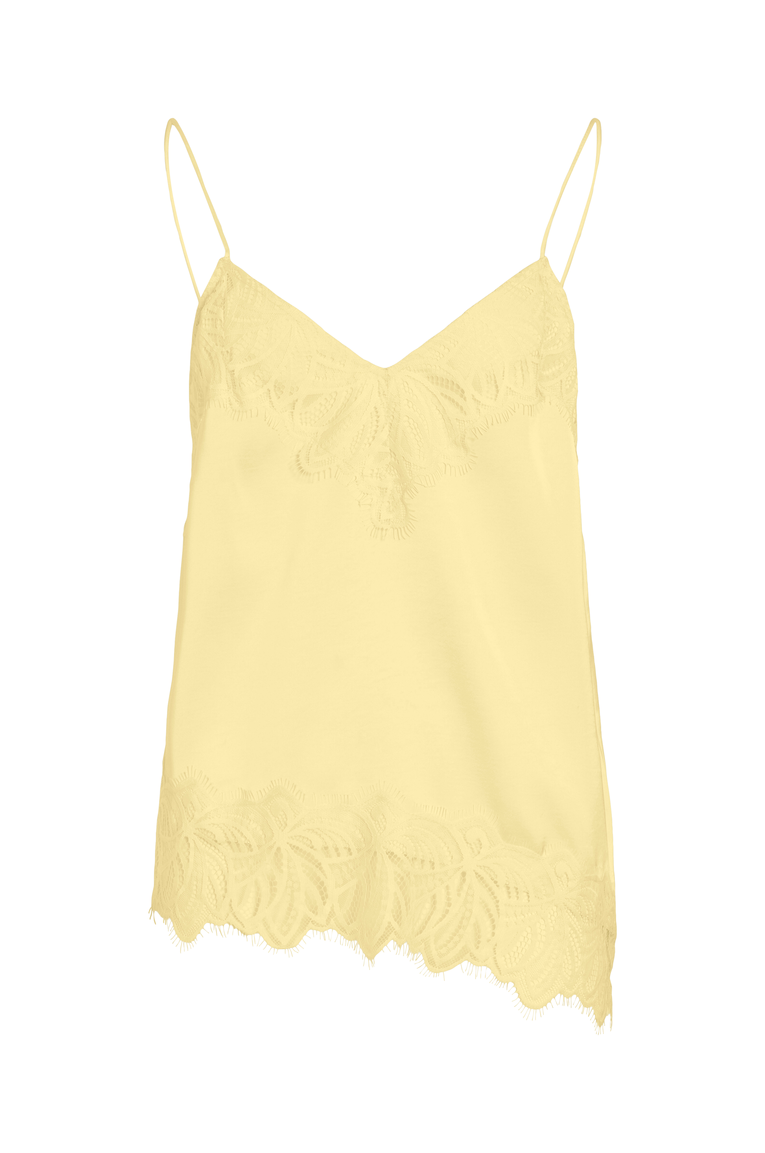 • Ermløs undertøyssinglet i sateng med tynne skulderstropper• Påsydde blonder oppover foran og på bunnen• Asymmetrisk hem