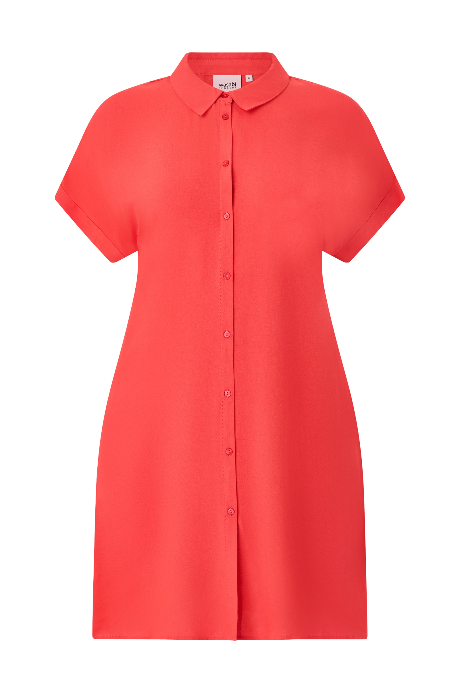 • Myk kjole i viskose• Krage• Korte ermer• Knappelukking• Splitt nede i sidene• Pluss-størrelser• Lengde: 98 cm i størrelse 42