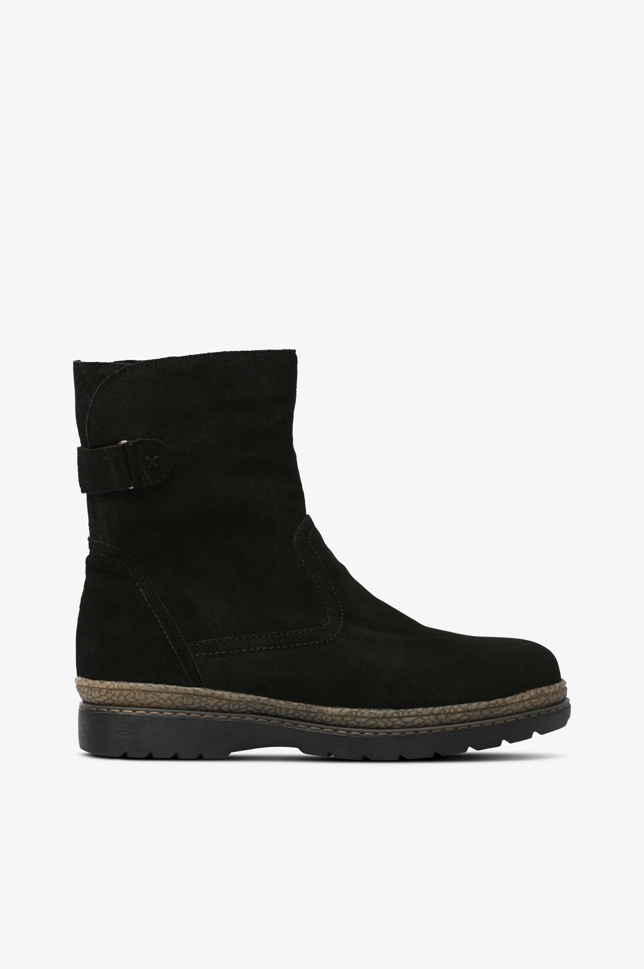 Boots i semsket skinn med varmt fôr i saueskinn. Tamp bak på skaftet og glidelås på innsiden. Innersåle i skinn.