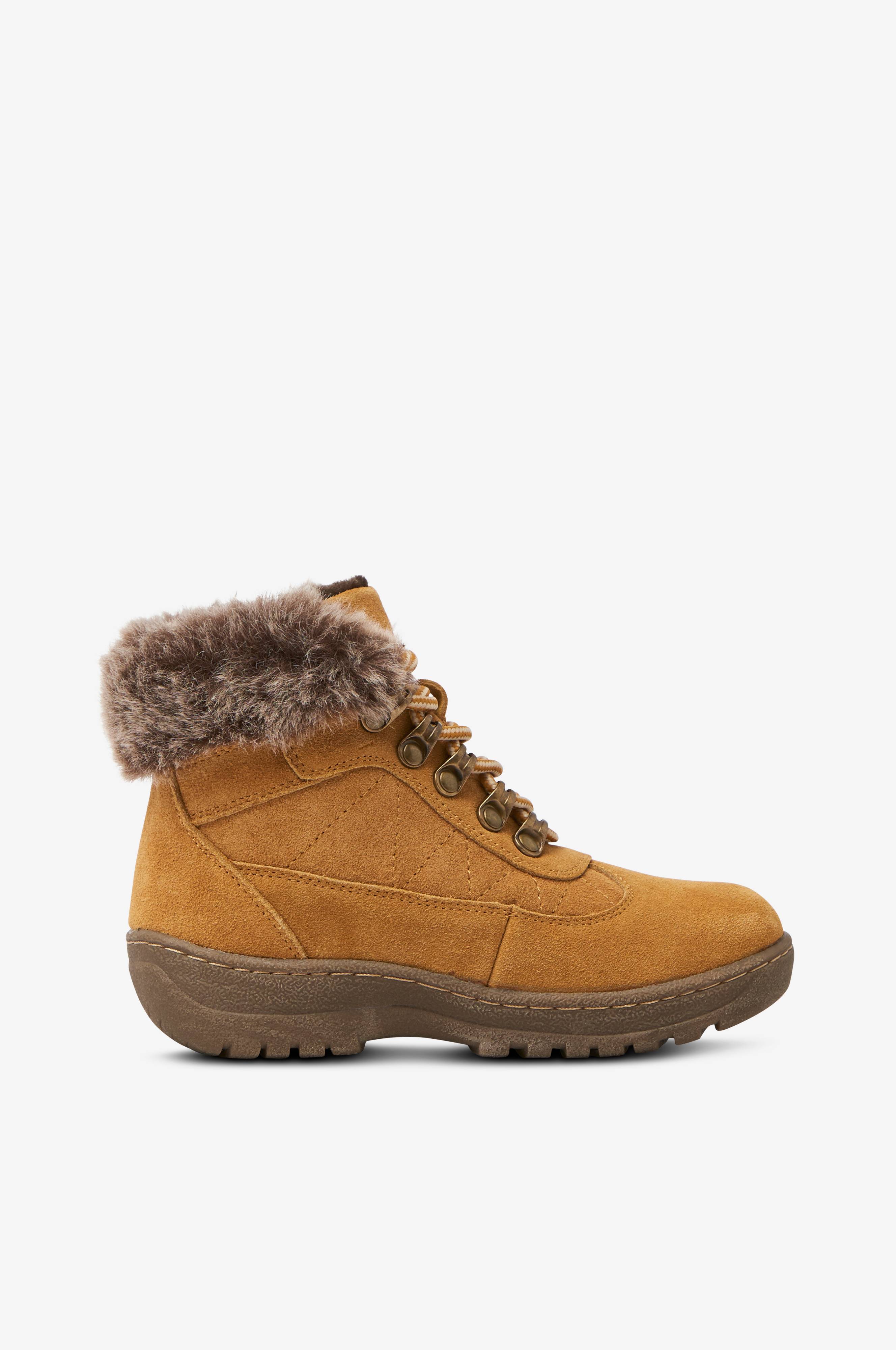 Støvler Plymouth fra Wildflower i semsket skinn med varmende fuskepelsfôr som også er synlig på skaftet. Snøring gjennom metallringer og glidelås på skaftets innside.