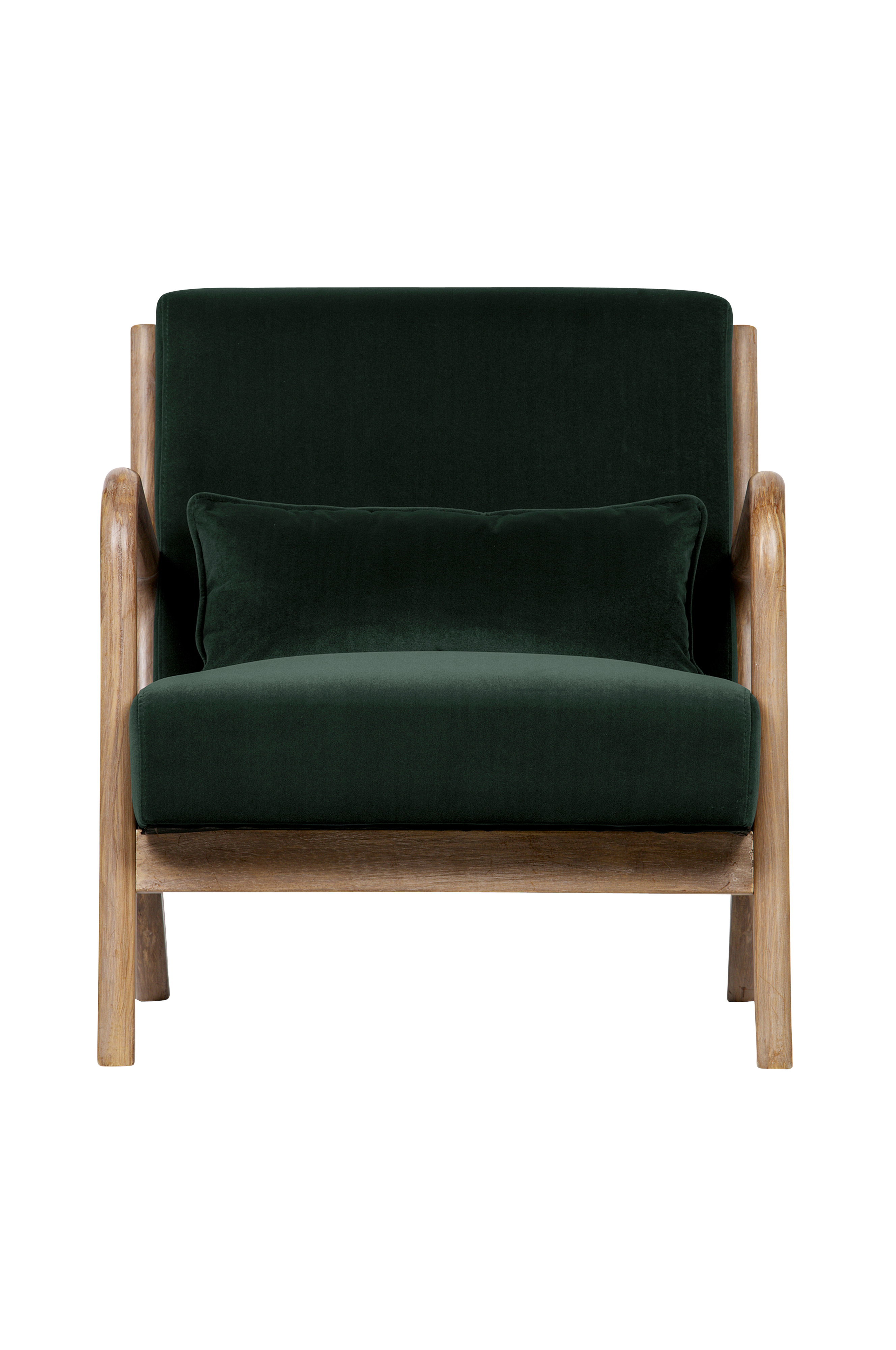 Armlene, ben og ramme på denne behagelige lenestolen er laget av gummitre. Mark lenestol er kledd med et luksuriøst fløyelsstoff.