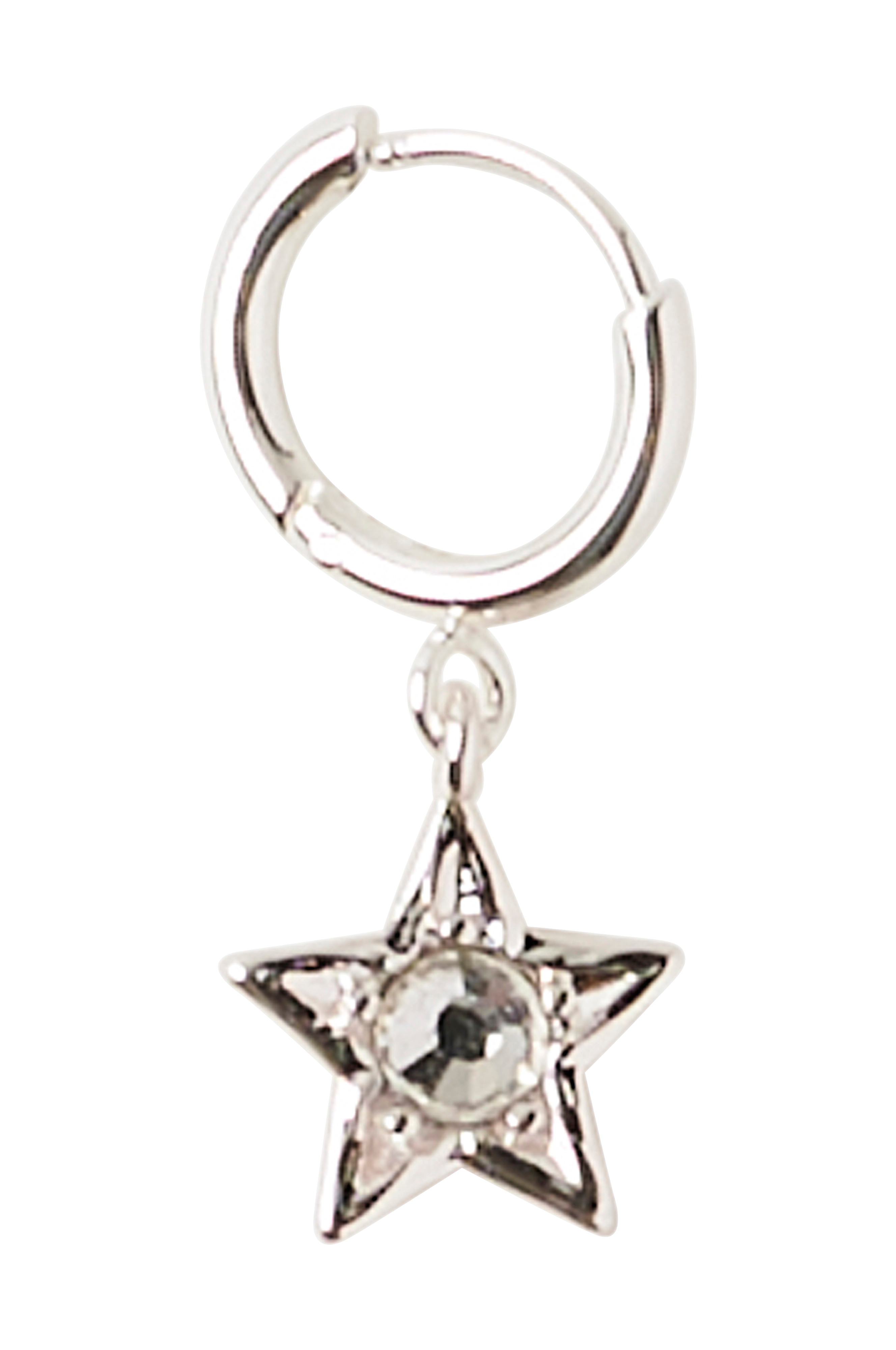 Singeløredobb i form av en stjerne med en klar stein i midten. Singeløredobben er en perfekt måte å skape en personlig look på. Brukes alene eller sammen med andre singeløredobber. Sølvbelagt stål med lite stjerneanheng med en liten stein i glass. Størrelse ring 11 mm.