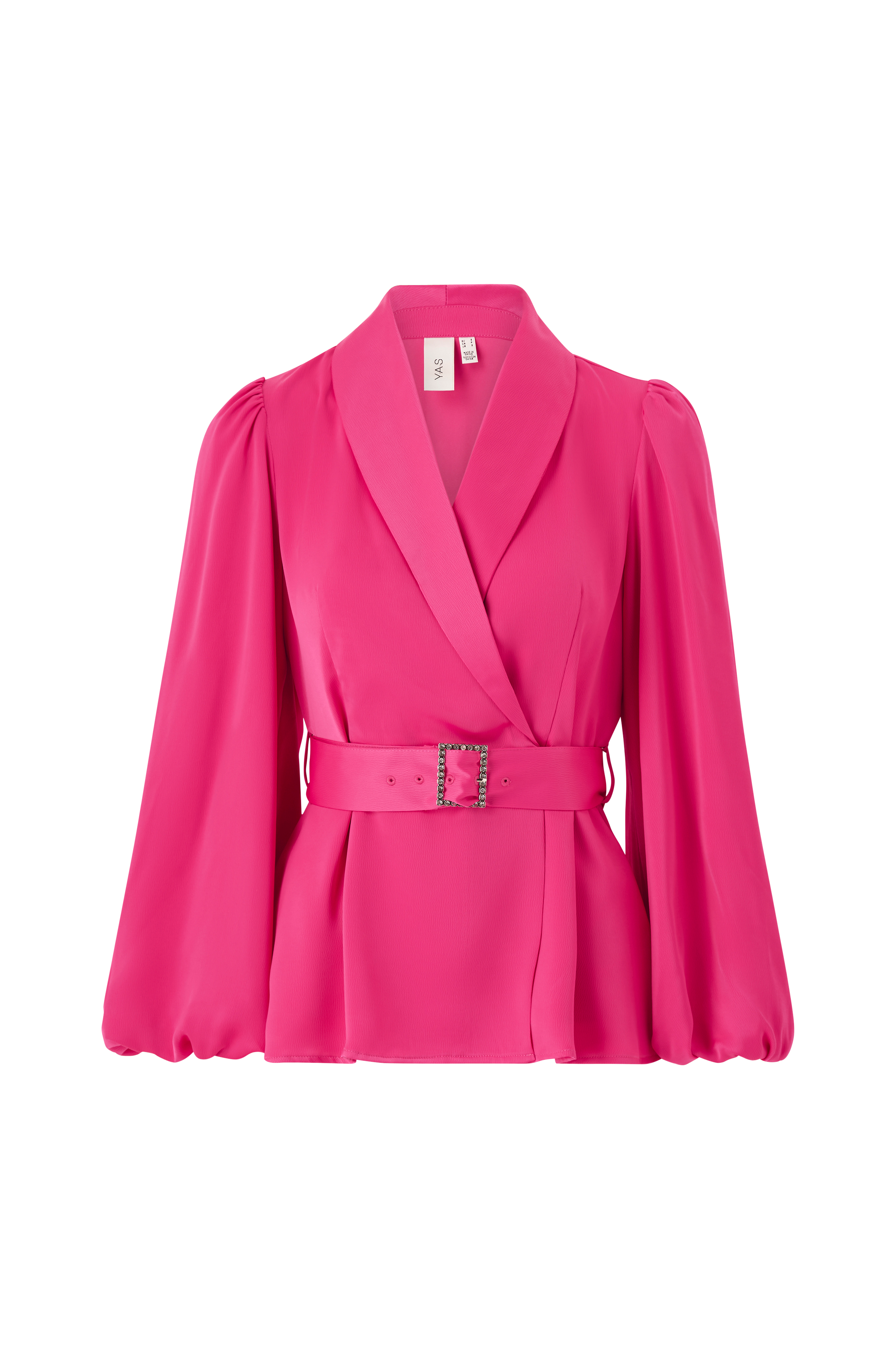 • Omslagsdesign med knapp i siden• Voluminøse ballongermer• Belte med rhinestone-detalj