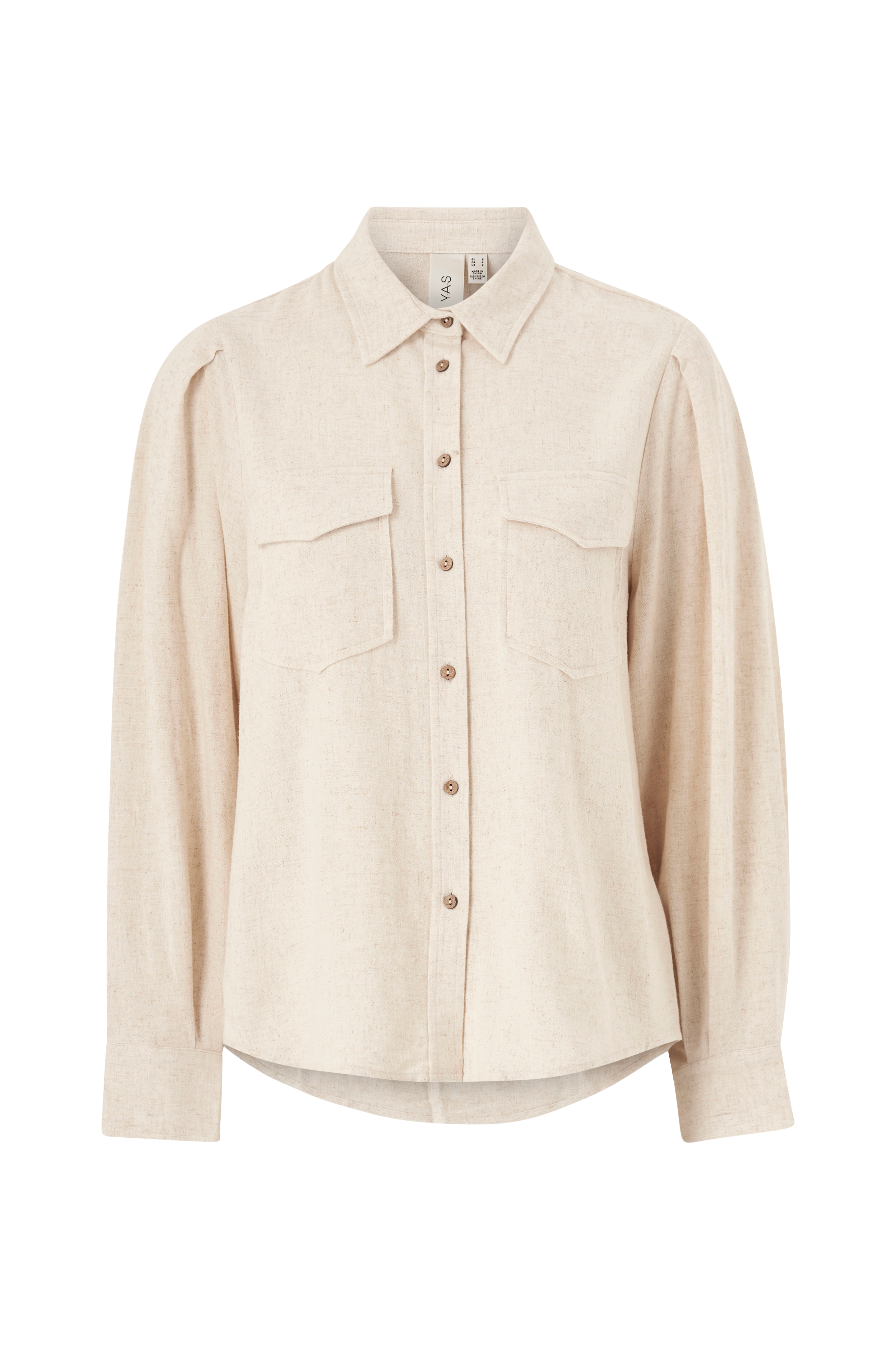 • Bluse i linmiks• Knapper foran• To brystlommer• Folder på skuldrene• Lange ermer med mansjett