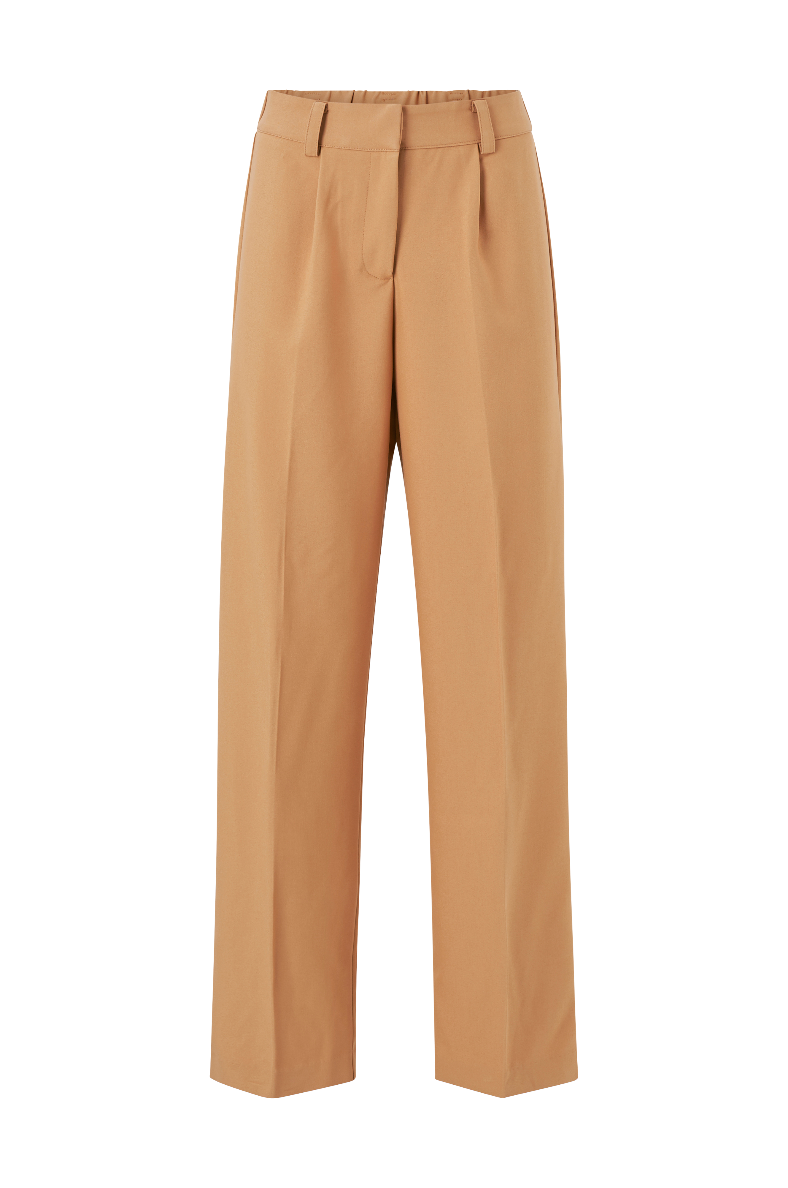 Vid penbukse med lagte legg i midjen og presslegg. Elastikk i midjen bak og hekte foran. Fuskelommer bak. Indre benlengde ca. 77 cm i str S.