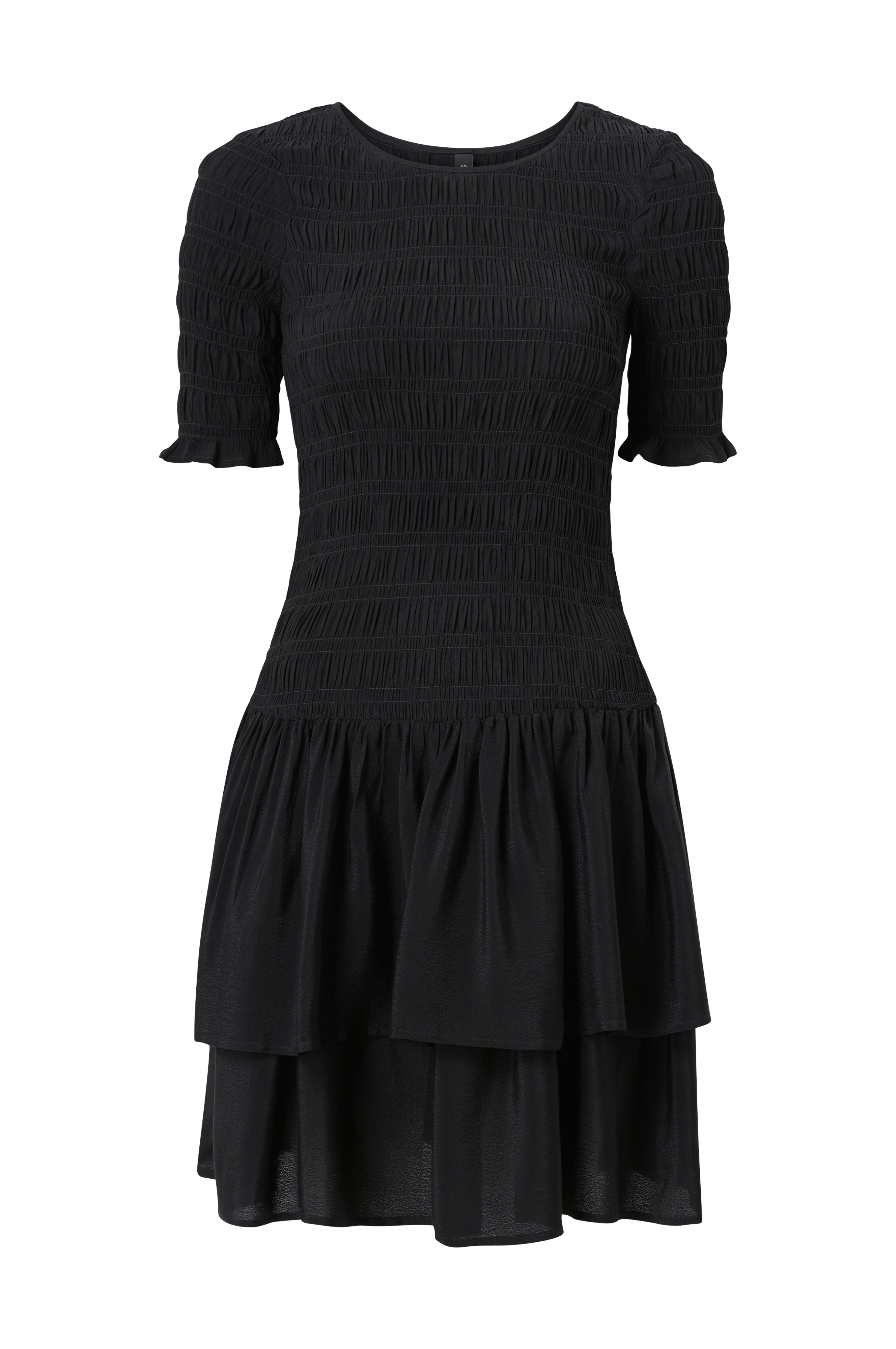 Kjole med overdel med vaffelsøm. Korte ermer og rund hals. Volangskjørt i glatt kvalitet med fin glans. Lengde ca. 93 cm i str S.