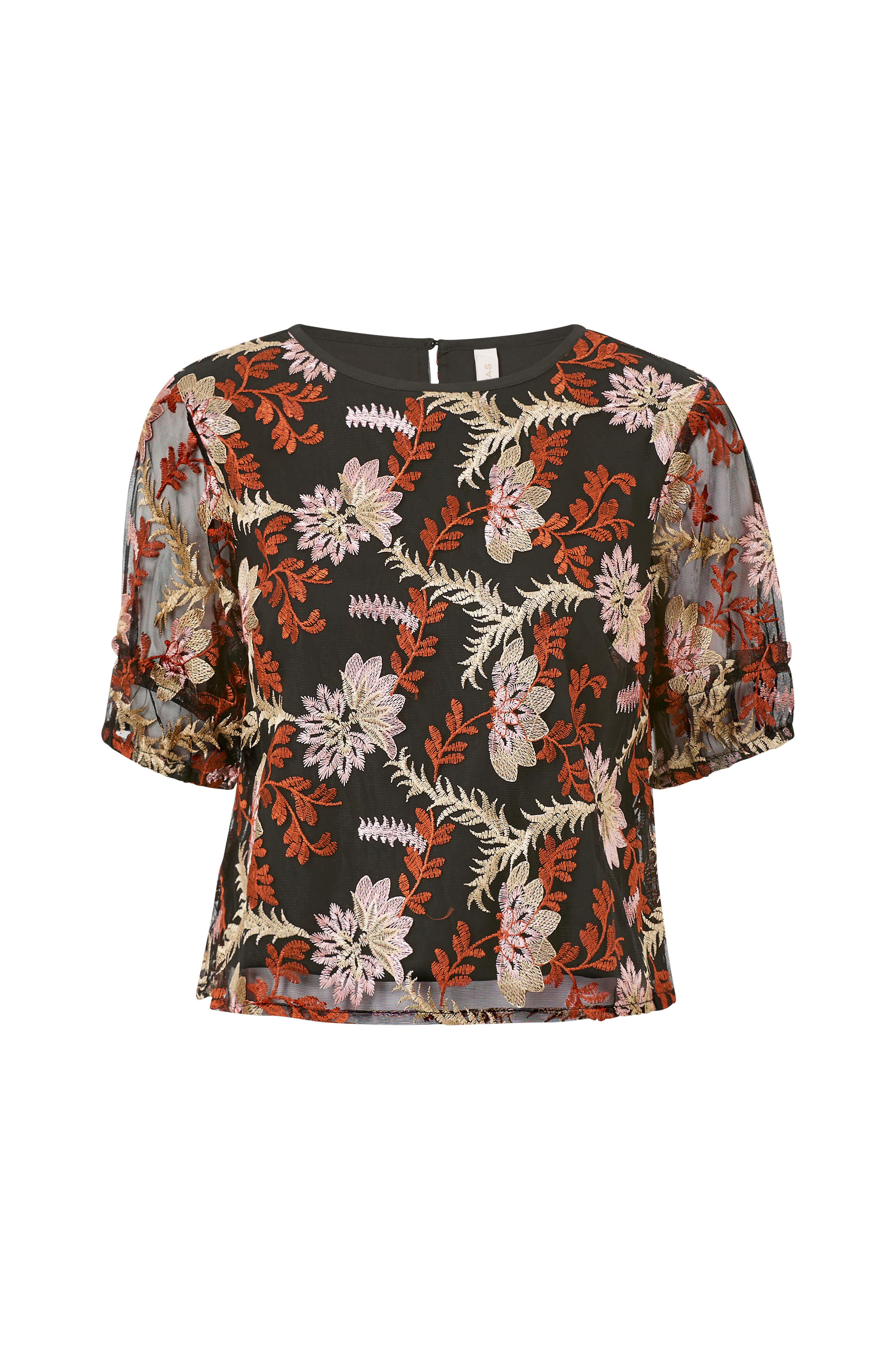 Topp yasJayne 2/4 Top fra Y.A.S. Rett modell i meshkvalitet med broderier over hele. Rund hals med smal båndkanting og splitt med knapp i nakken. Korte ermer med lagte legg nederst og innfelt strikk i ermekantene. Vevd fôr.