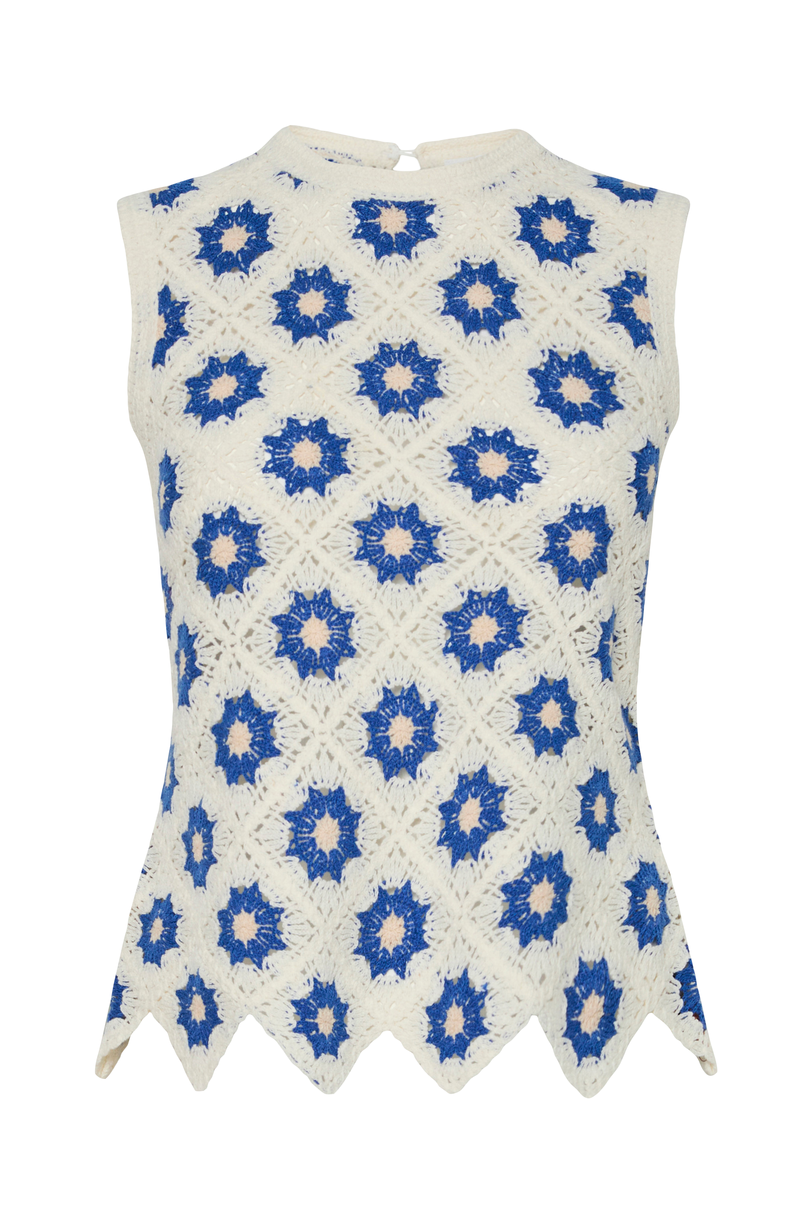• Ermløs modell• Mønstret design• Rund hals• Nøkkelhulsåpning bakpå med knapp• Bølget hem
