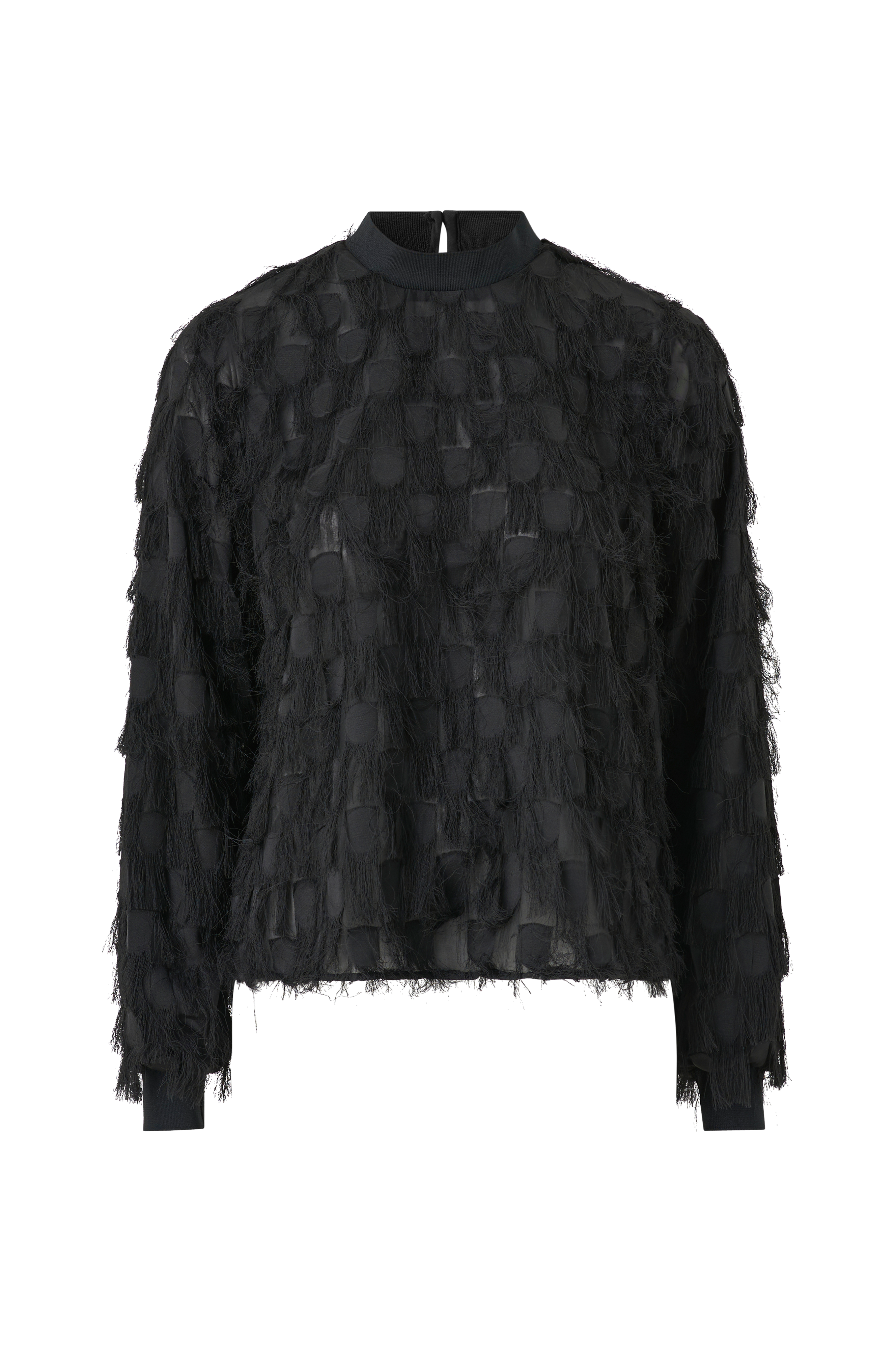 • Semitransparent bluse med vevd mønster og frynser• Ribbet mansjett i ermeslutten• Ventilasjon med knapper i nakken