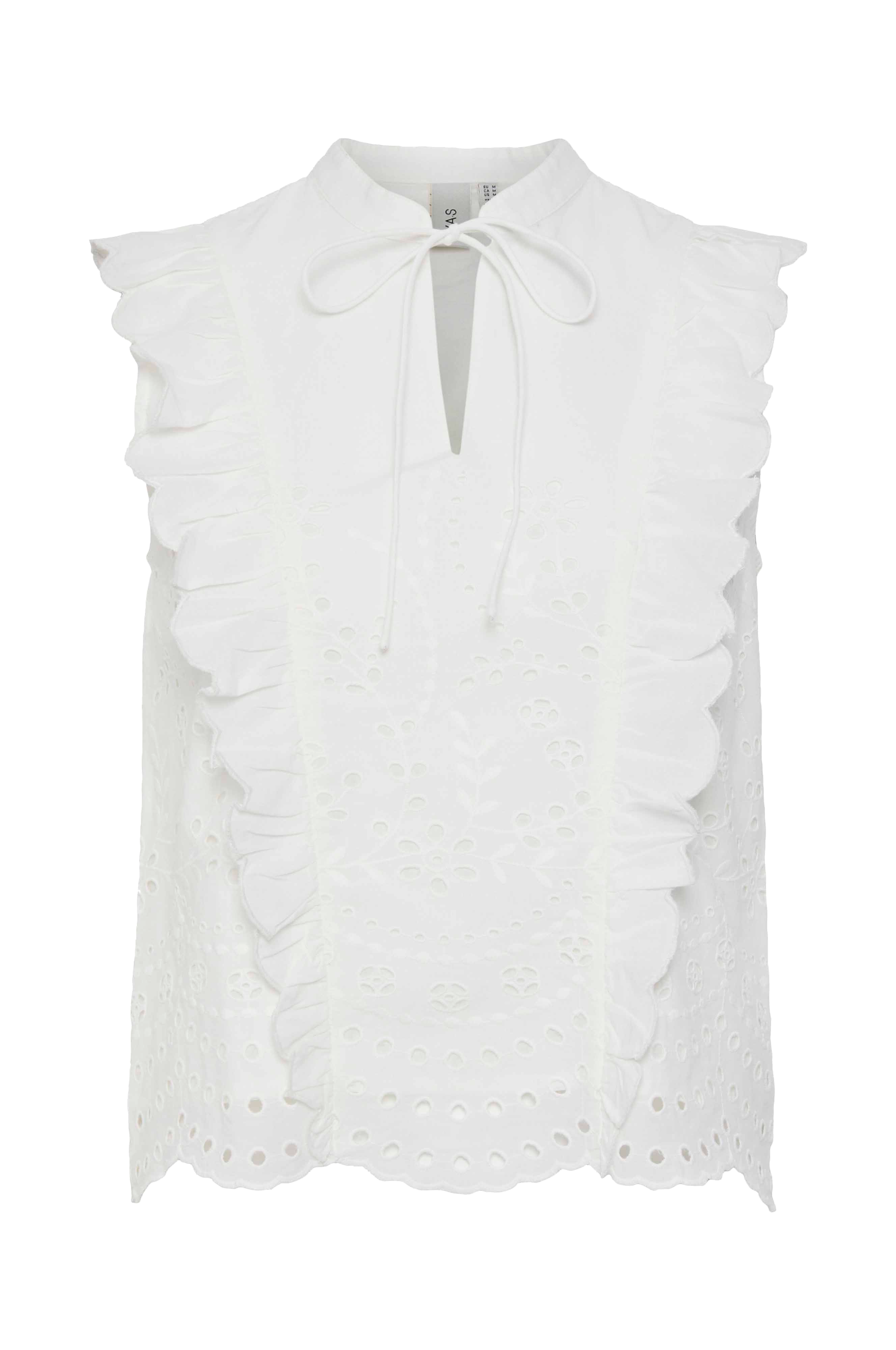 • Ermløs modell med hullbroderier• Rund hals med knytbar tråd foran• Volang foran, bakpå og over skuldrene