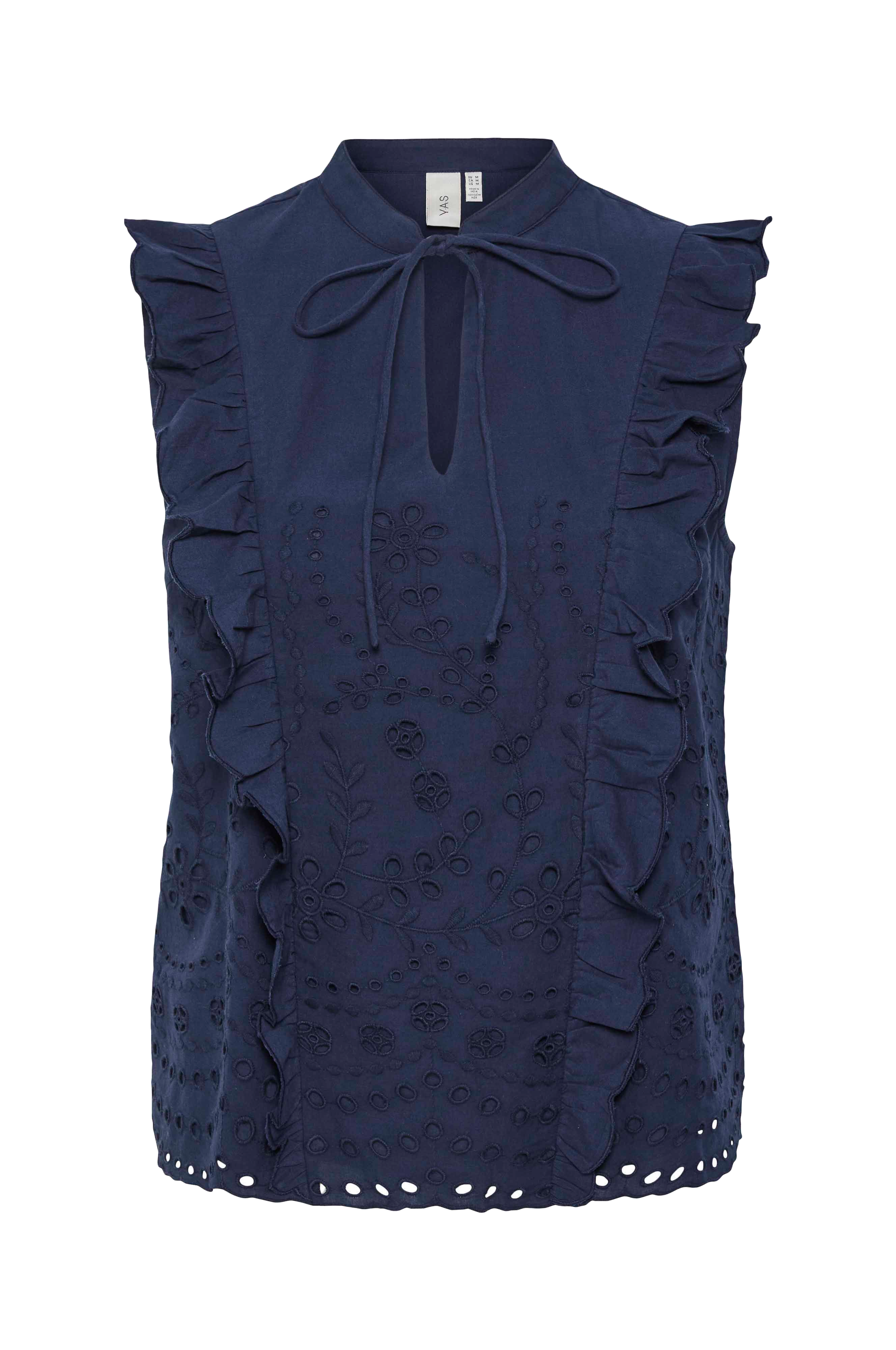 • Ermløs modell med hullbroderier• Rund hals med knytbar tråd foran• Volang foran, bakpå og over skuldrene