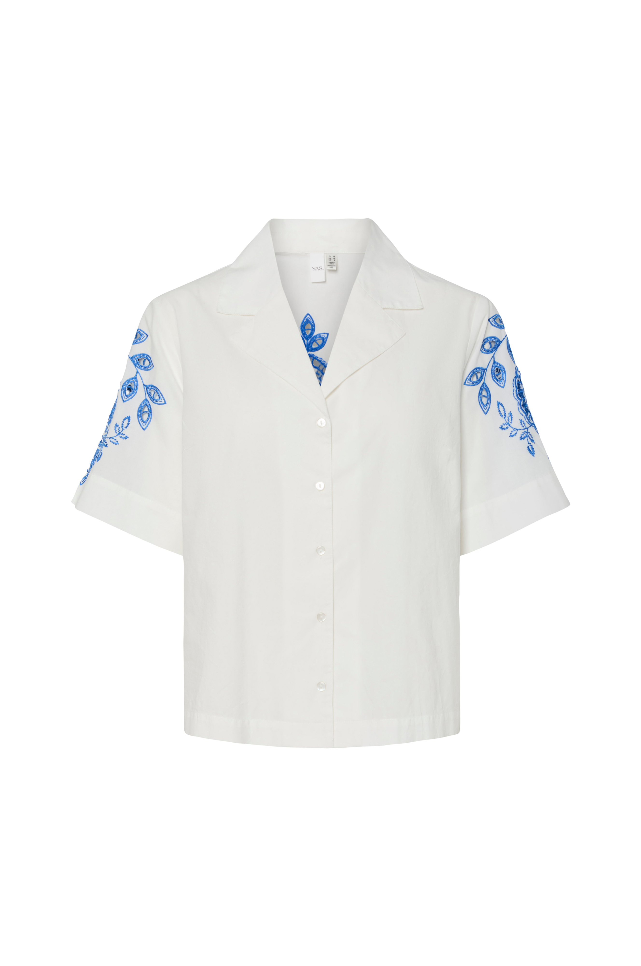 • Bluse i bomull med hullbroderier• V-formet hals med krage• Korte ermer• Knapper foran