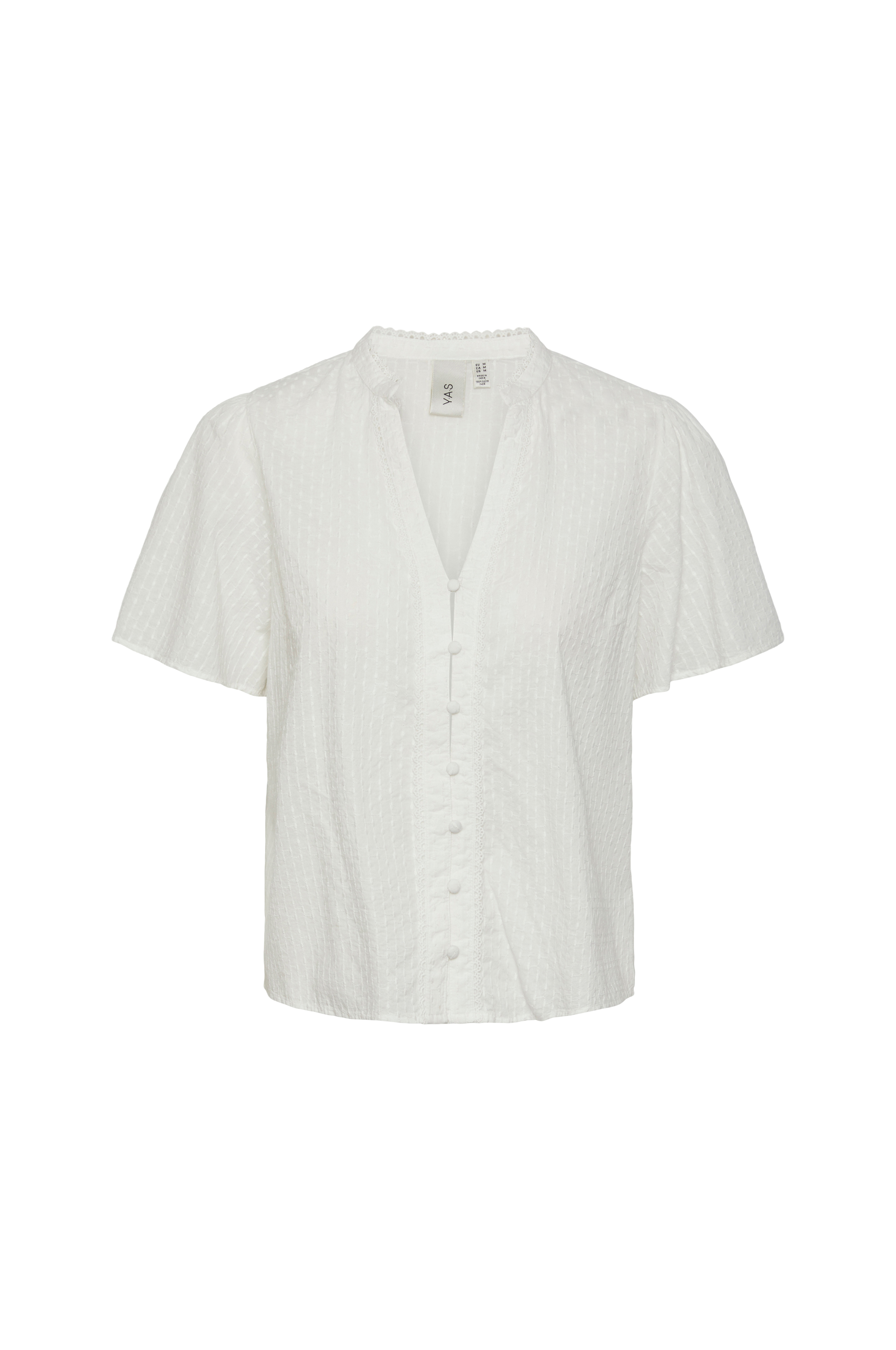 • Bluse med strukturmønster• V-hals snitt• Kledde knapper foran• Korte bobleermer