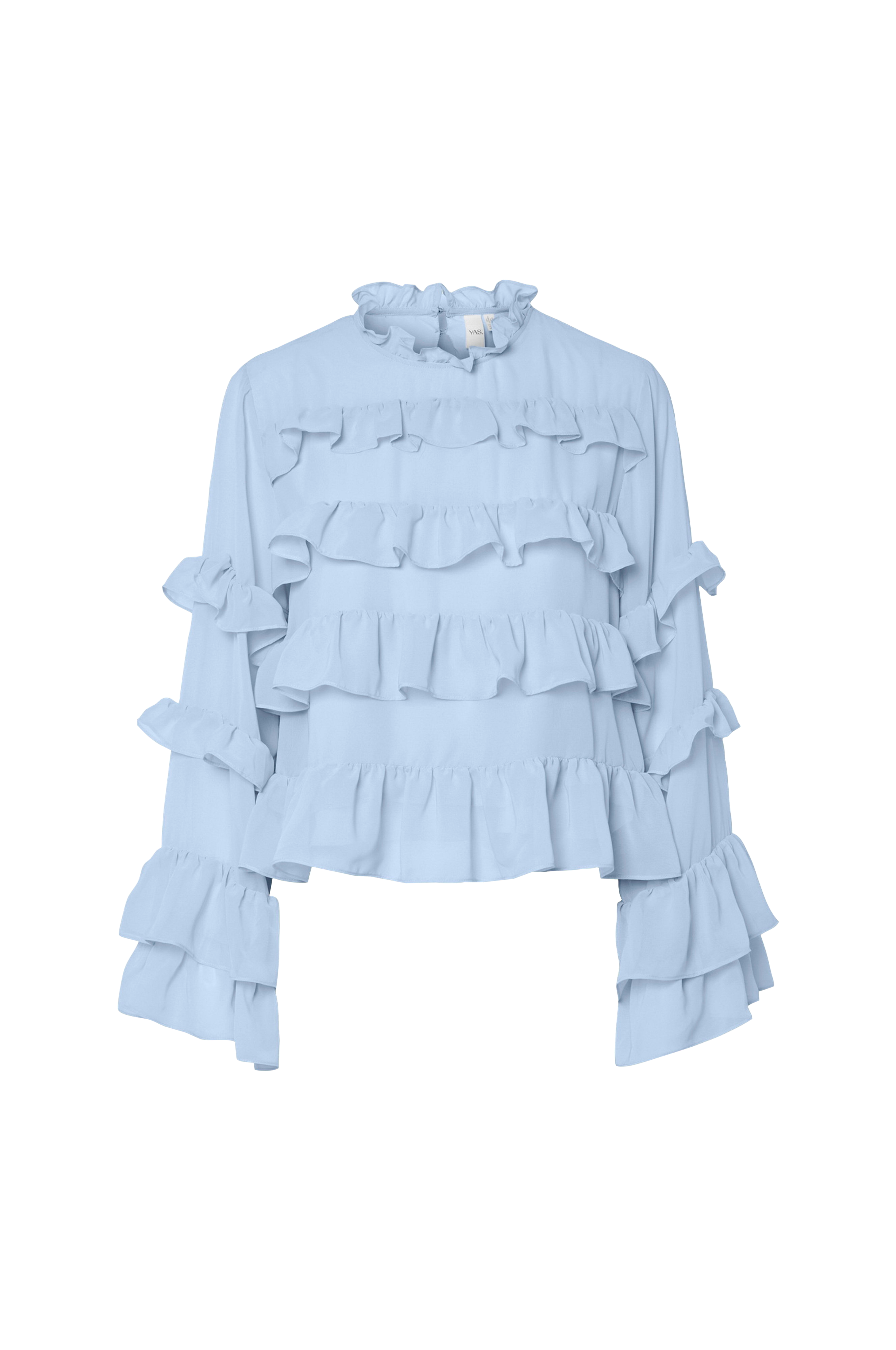 • Langermet bluse i chiffon med volanger rundt• Rund hals med volangkant• Lange ermer med volanger• Nøkkelhulsåpning med knapper i nakken• Vevd innsidefôr