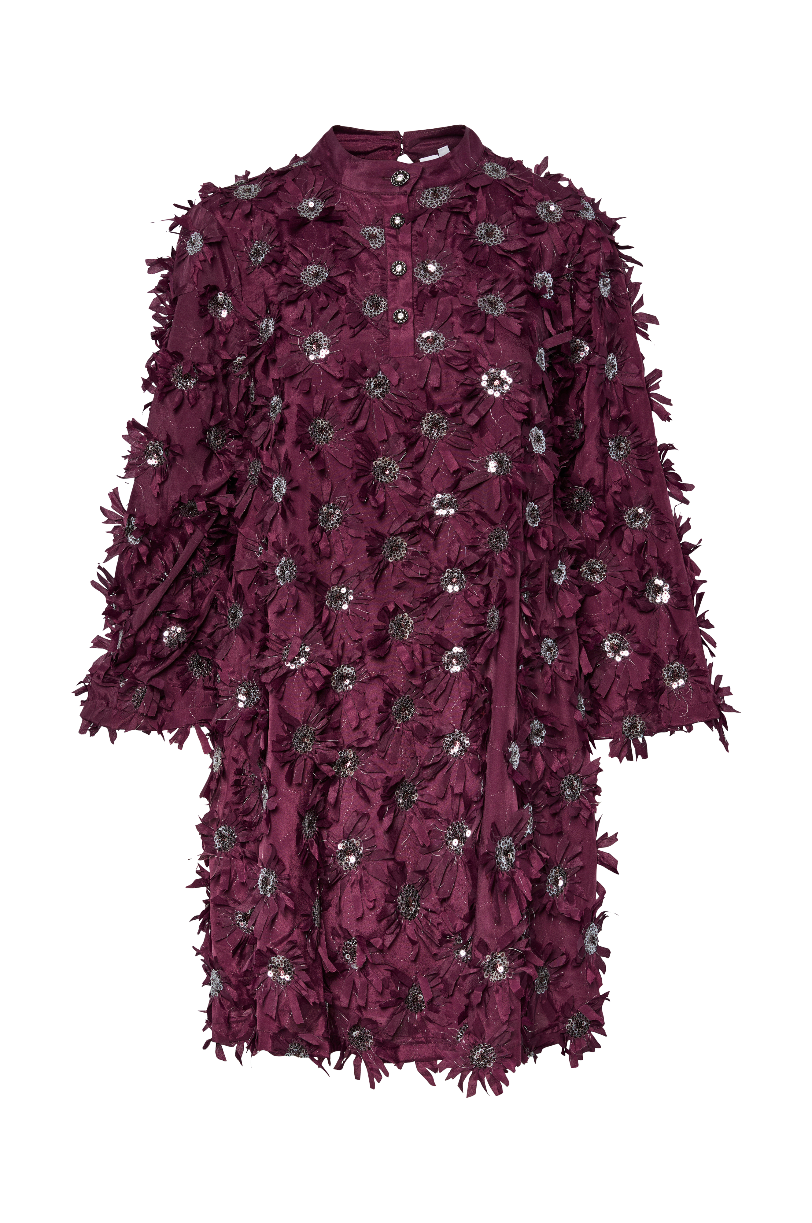 • Utsvingt modell• Blomstret applique med paletter overalt• Kant i halsen med kledde knapper i nakken og kort frontknepping foran• Bredt erme• Fôret• Lengde: 89 cm i størrelse S