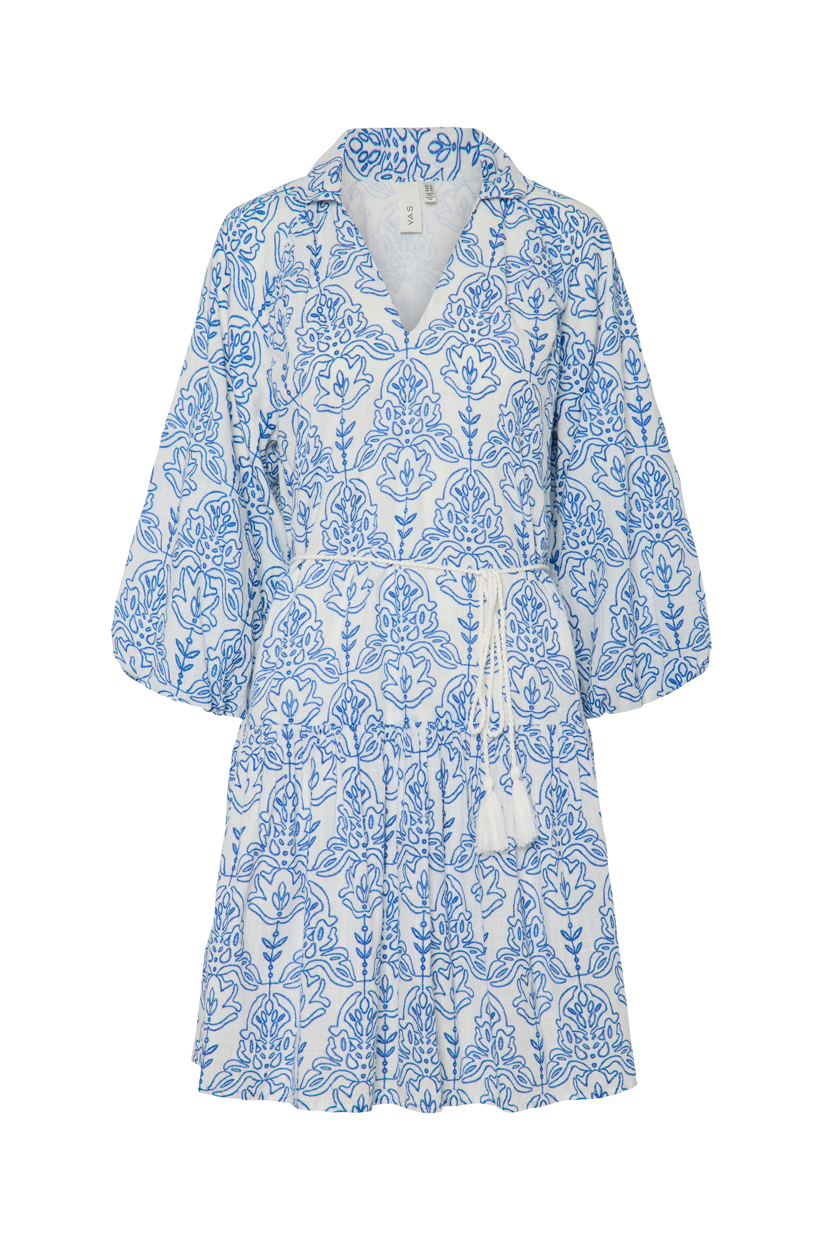 • Fôret kjole i bomull med ballongermer 3/4 lang• V-formet hals med krage• Gummistrikk i ermeslutten• Avtagbar knytbar tråd ved midjen• Sidelommer• Volang på bunnen• Lengde: 94 cm i størrelse 36