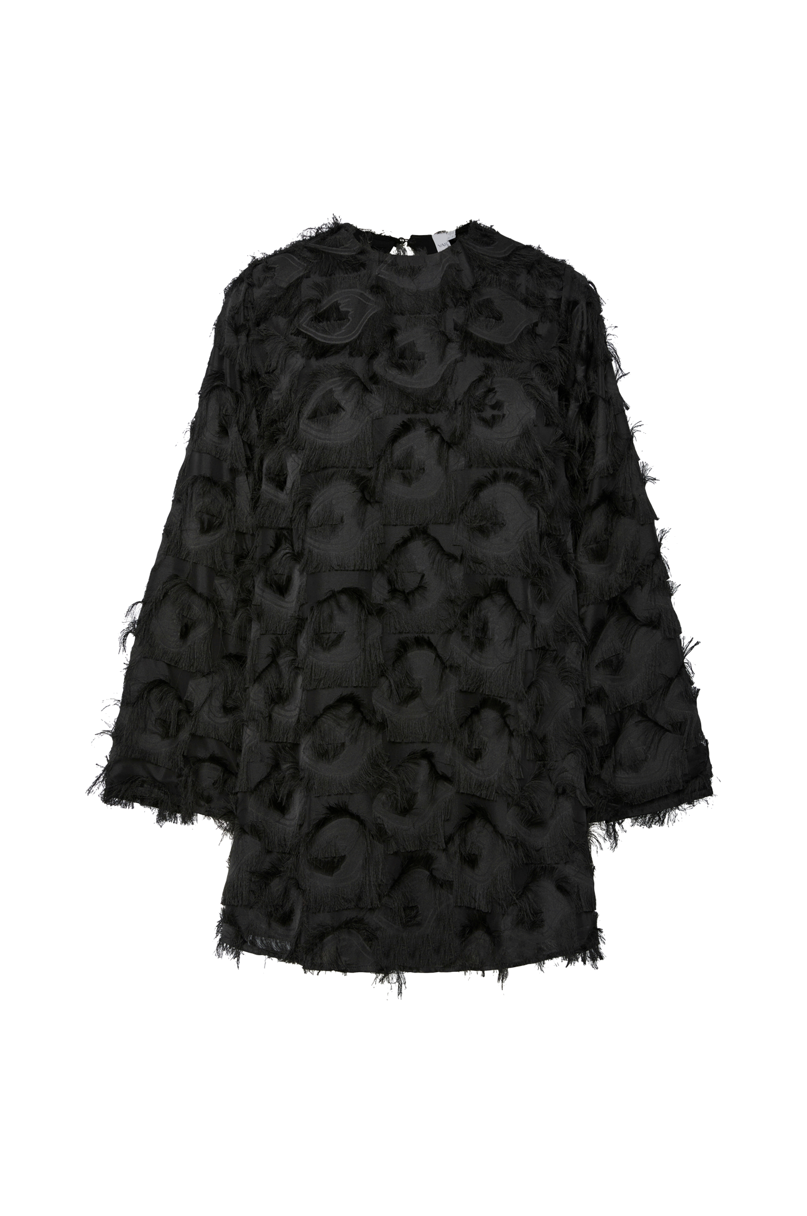 • Kort, fôret kjole med vevd mønster med frynser• Lange, utsvingte ermer• A-linjeformet modell• Åpen rygg med knapp på toppen• Lengde: 92 cm i størrelse 36