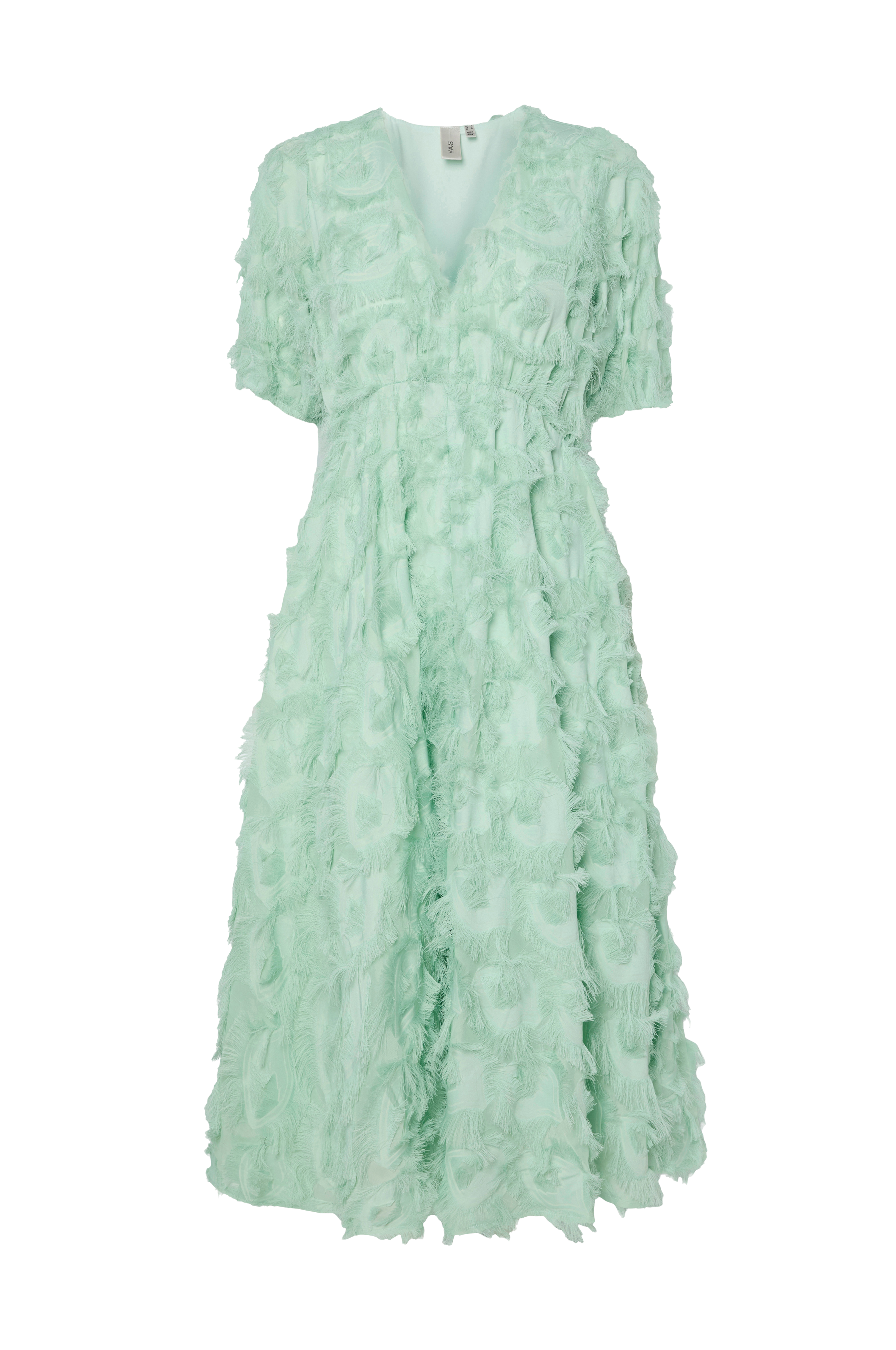 • Figurformet, utsvingt modell• Strukturmønster med tynne frynser overalt• V-formet hals• Kort erme med gummistrikk i ermeslutten• Definert, elastisk midje• Foring med påsydd tyll på underkjolen• Lengde: 122 cm i størrelse 36