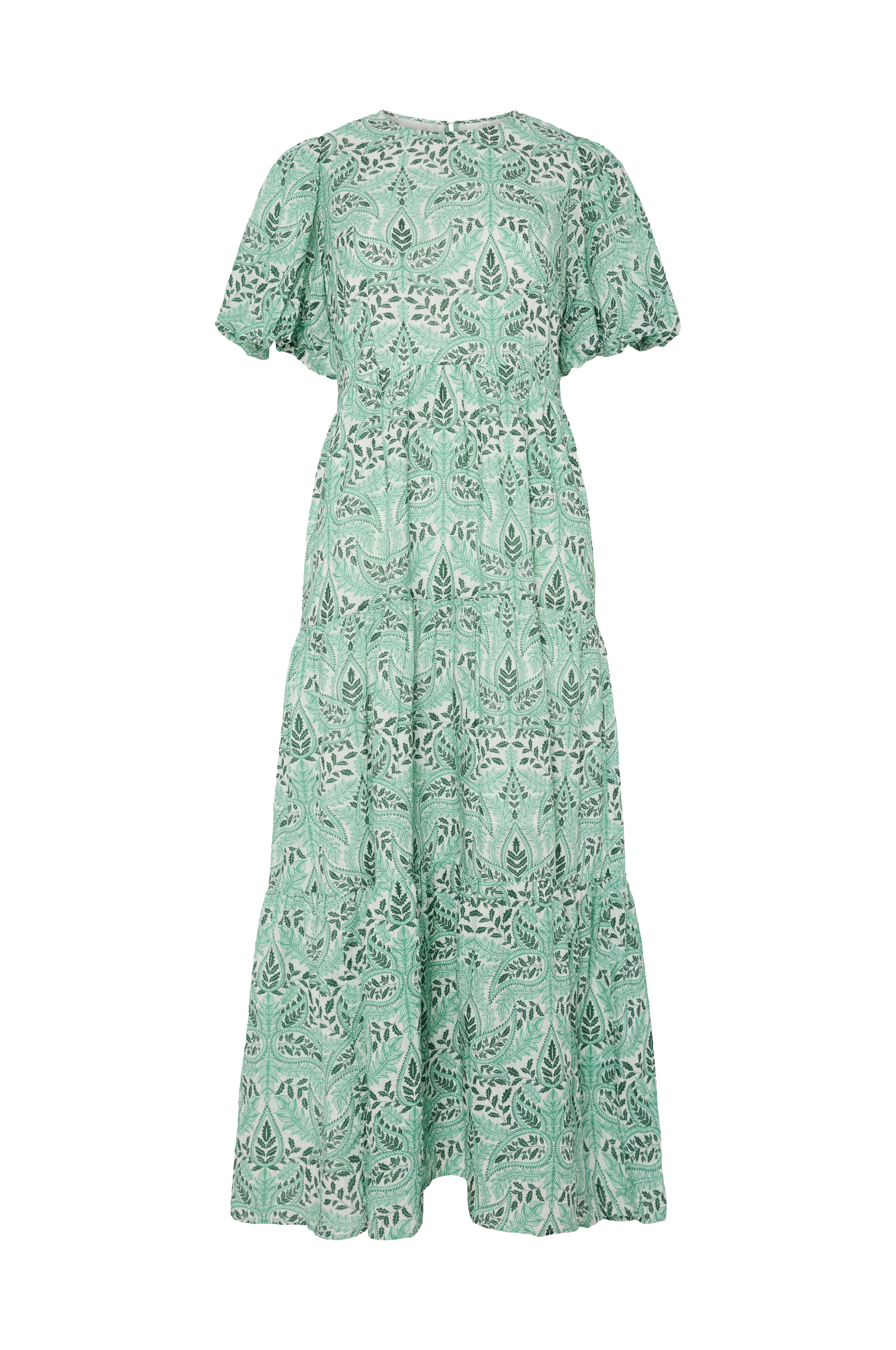 • Lang, mønstret kjole i bomull• Rund hals• Korte puffermer• Gummistrikk i ermeslutten• Krympede detaljer foran og bakpå• Tekstilfôr• Skjult glidelås i siden• Utsvingt nedre del• Normal passform• Lengde: 132 cm i størrelse 36