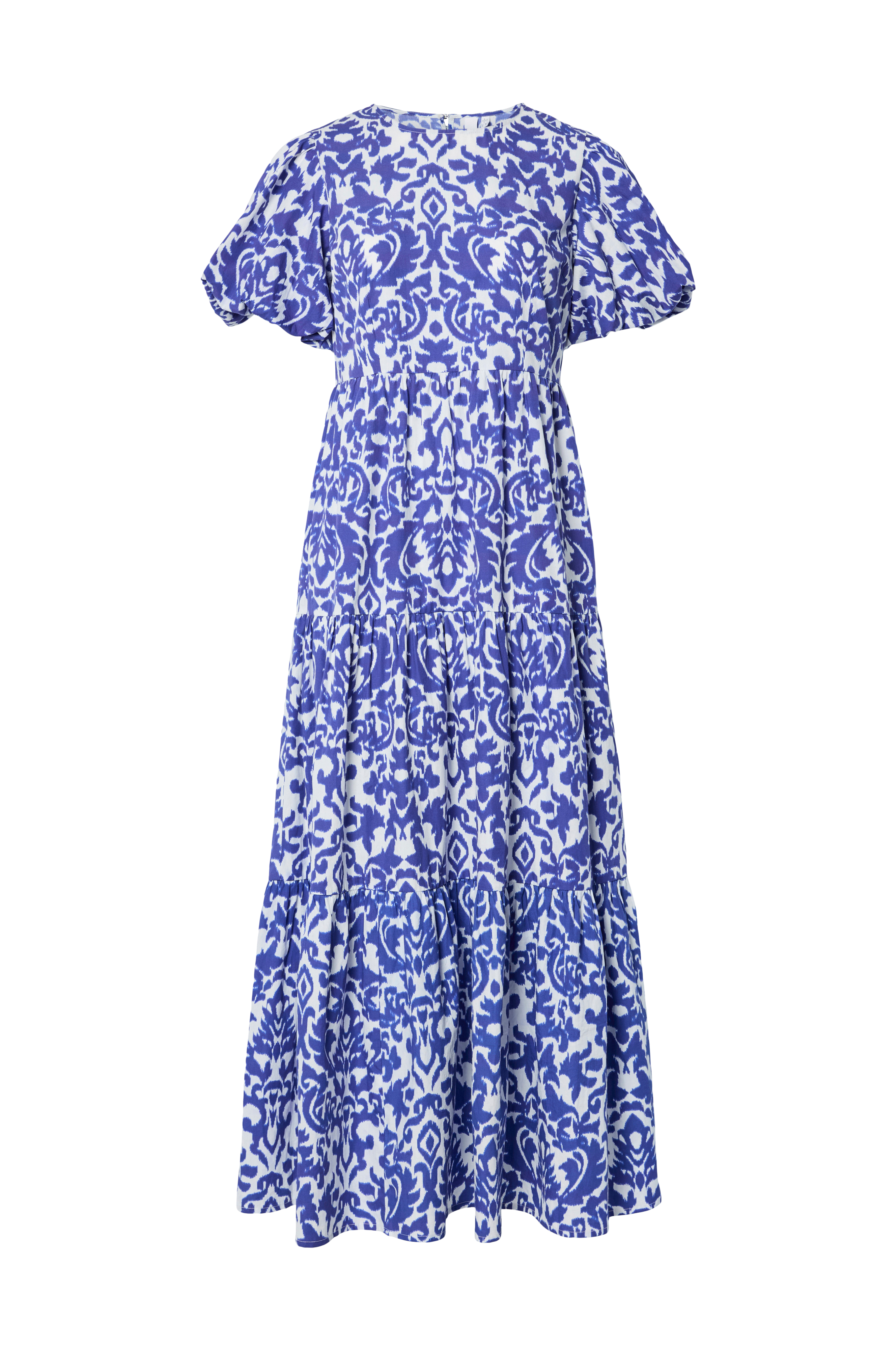 • Lang kjole i bomull• Rund hals med knappelukking i nakken• Korte bobleermer• Skjult glidelås i siden• Utsvingt skjørt med volang• Lengde: 134 cm i størrelse 36