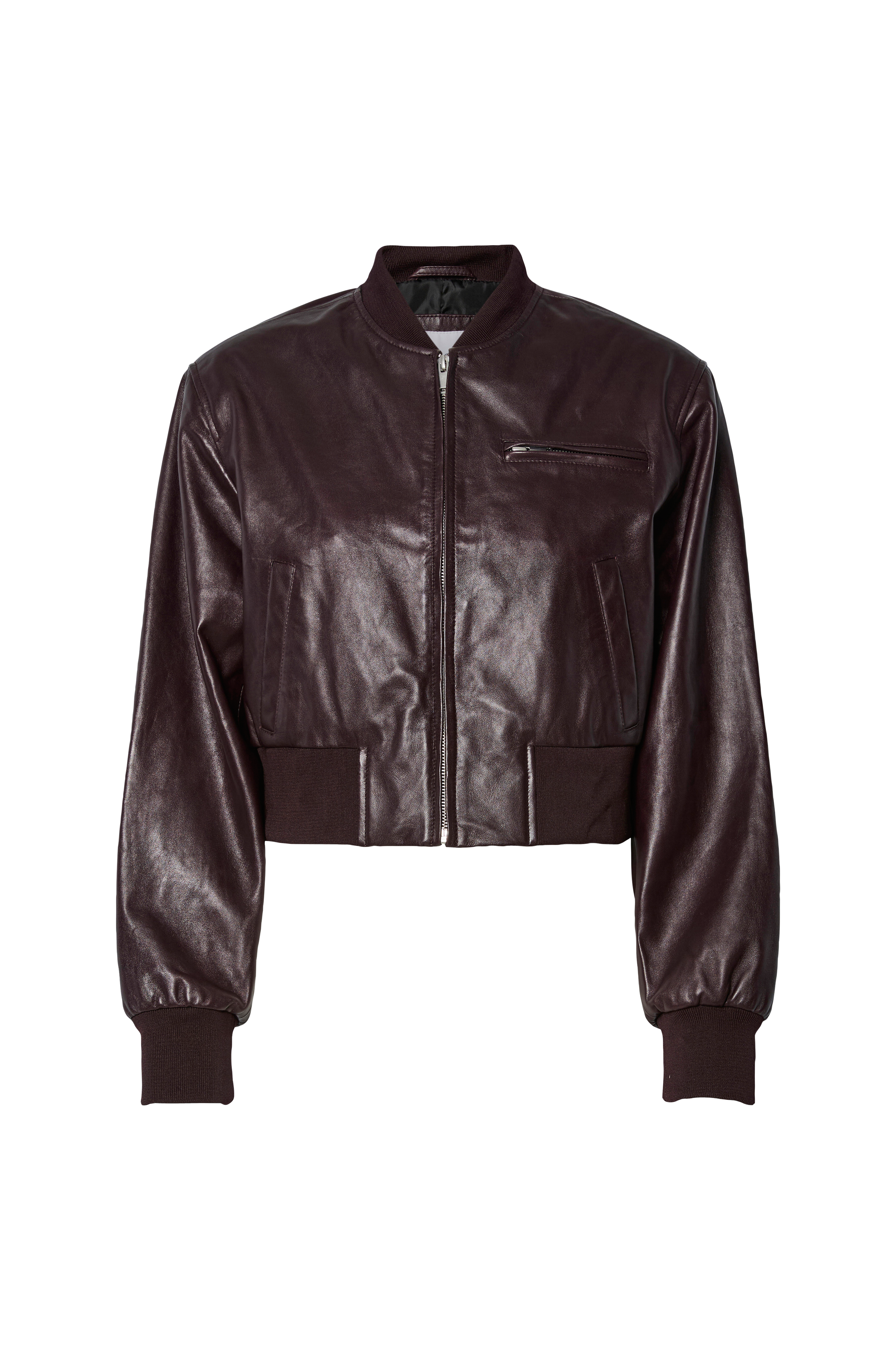 • Bomberjakke i skinn med kort, ribbet krage og skulderputer• Glidelåsfeste• Brystlomme med glidelås• Sidelommer• Ribbet mansjetter i ermeslutten og i nedre kant• Vevd innsidefôr• Lengde: 48 cm i størrelse 36