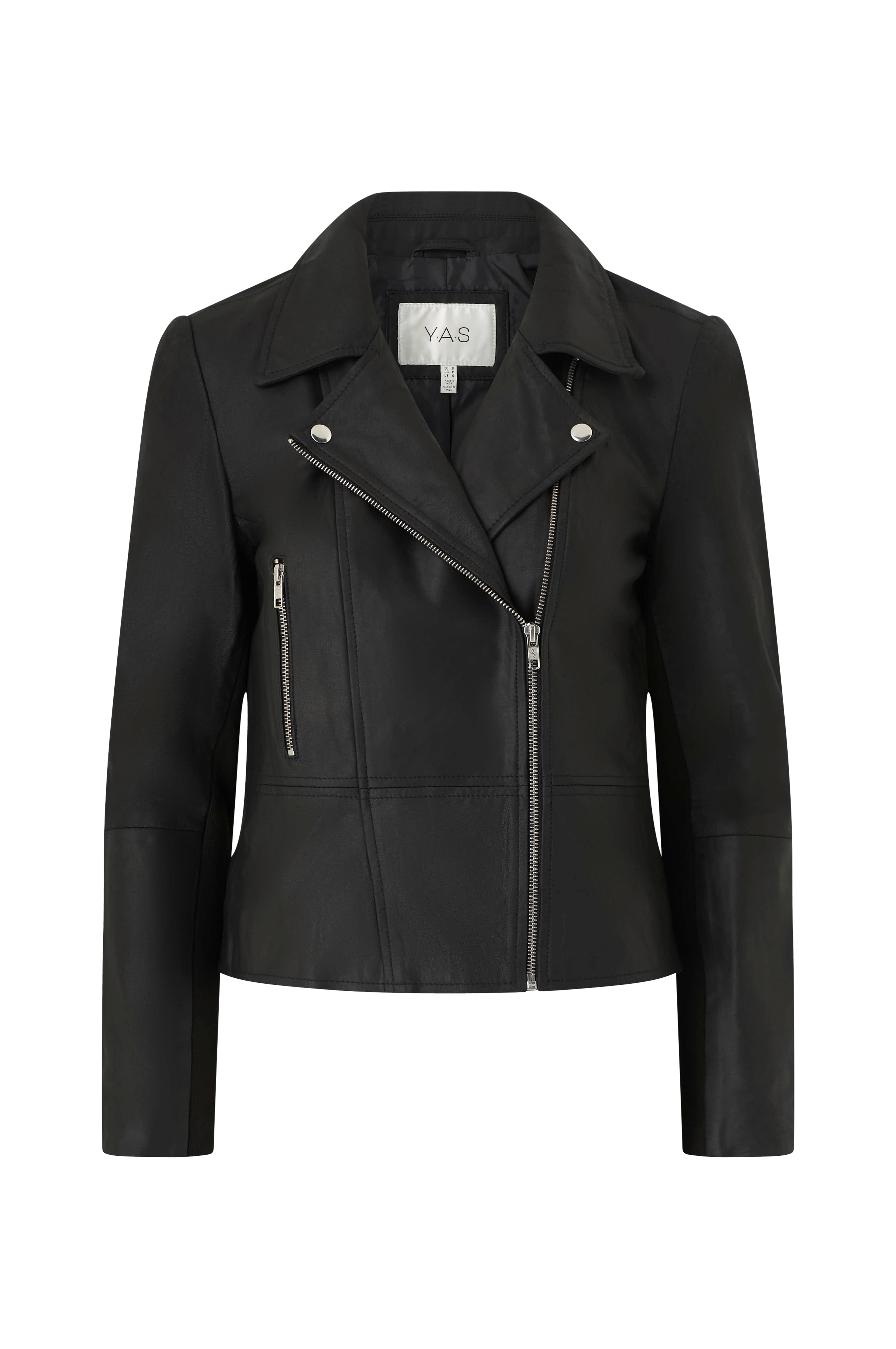 • Biker jakke i skinn med skråstilt glidelås og to trykknapper• To lommer med glidelås• Ribbestrikkede paneler langs med ermene• Vevd foring• Lengde: 53 cm i størrelse S