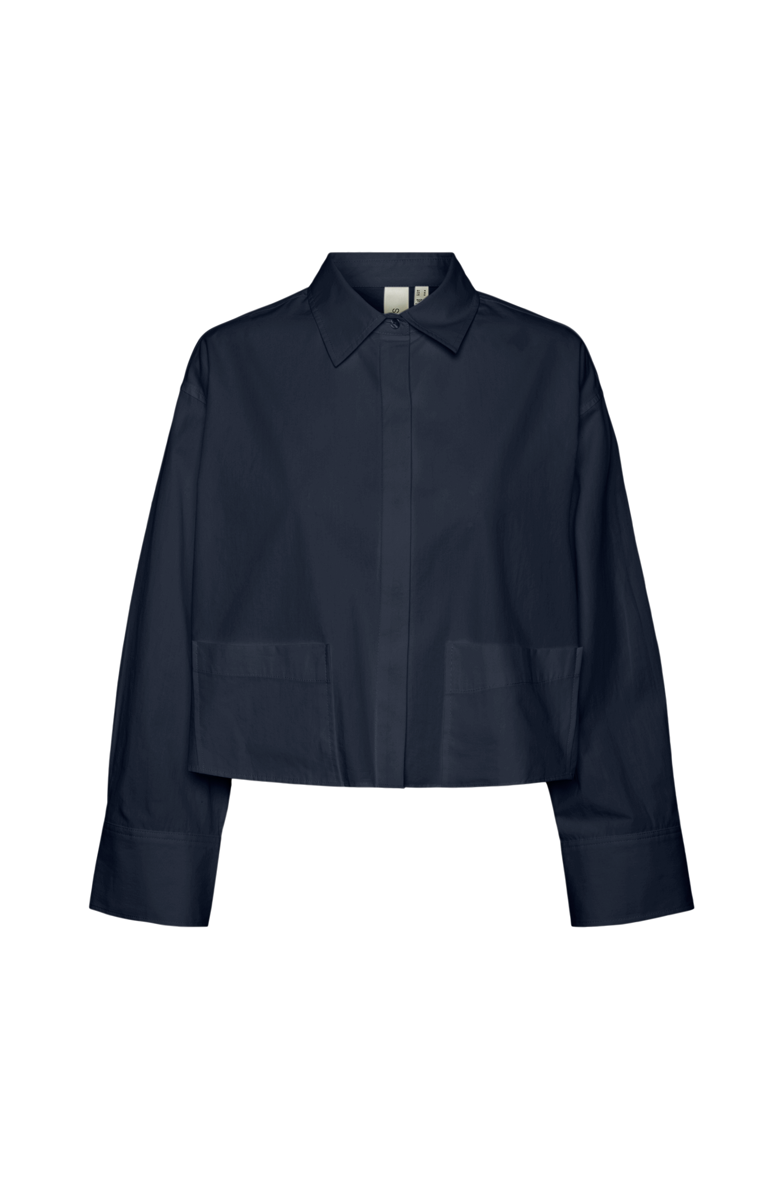• Skjorte med skjult frontknepping• Lange ermer med brede mansjetter og knapper• Åpne frontlommer