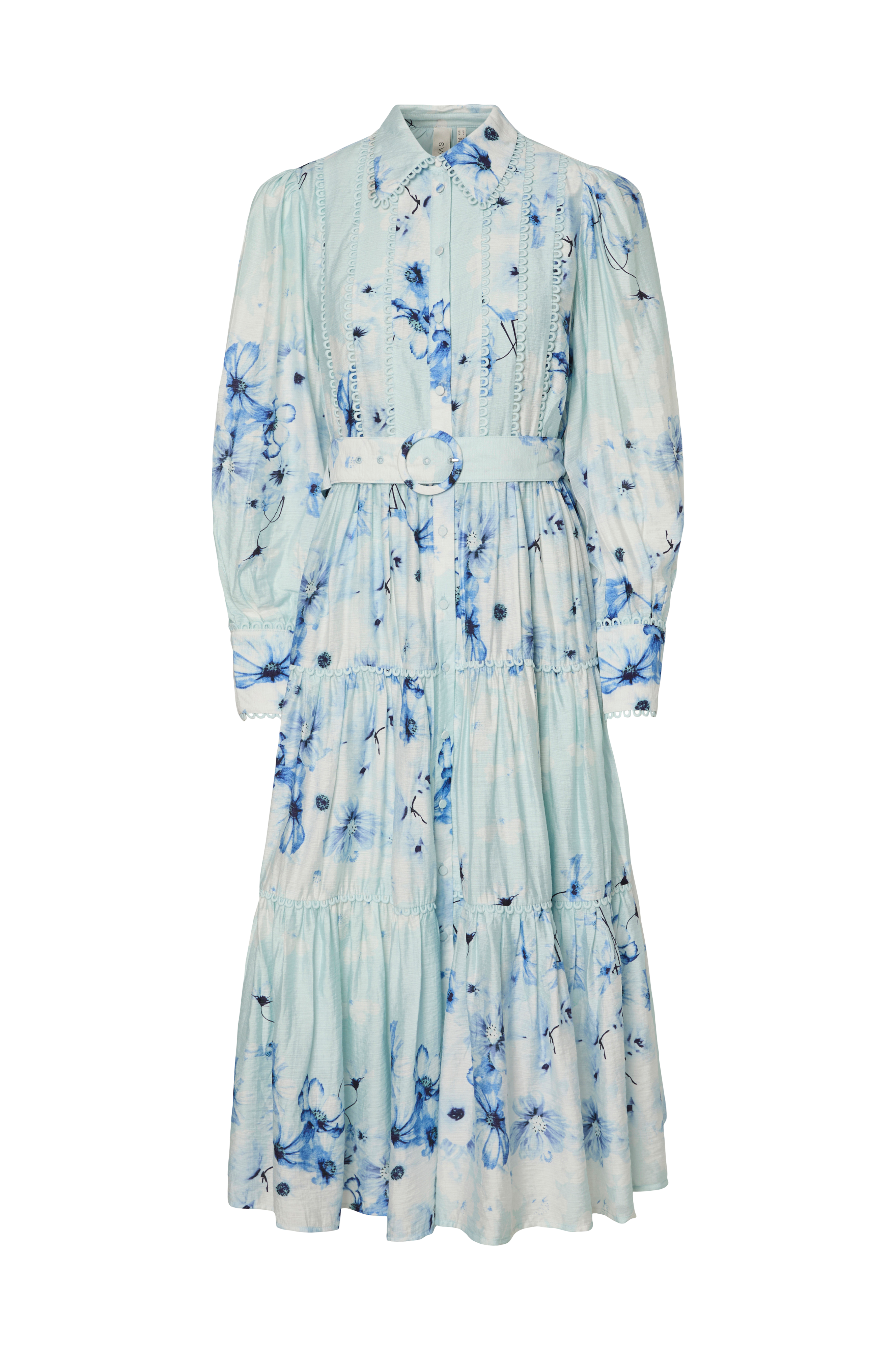 • Figurformet modell• Kledde knapper hele veien fram• Smale blondeinnfellinger• Elastisk midje med stropper og belte• Lang bobleerme med mansjett• Fôret• Lengde: 124 cm i størrelse 36