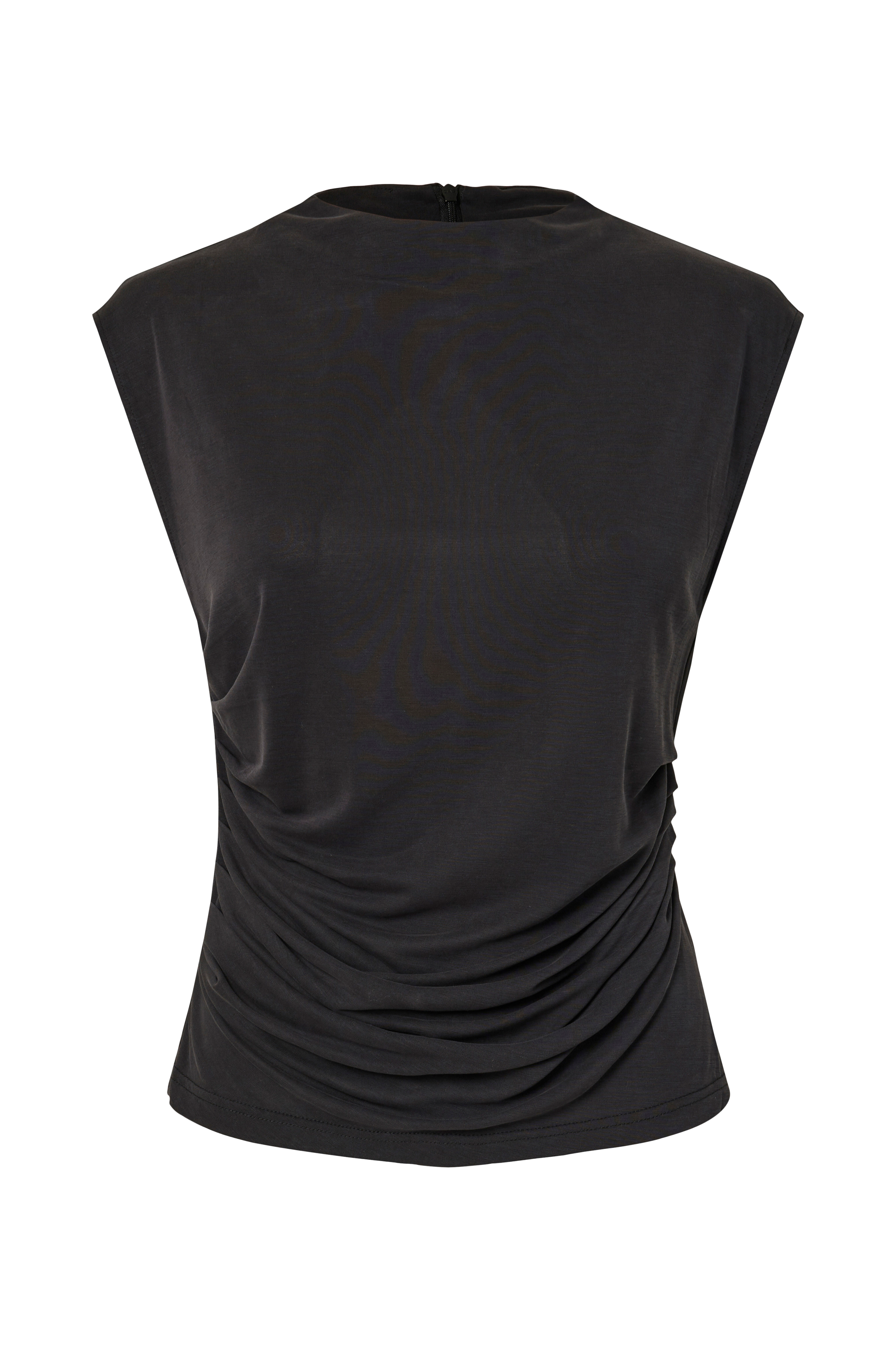 • Ermløs, stretchy topp med rund, høy hals• Drapering ved midjen• Glidelås i nakken
