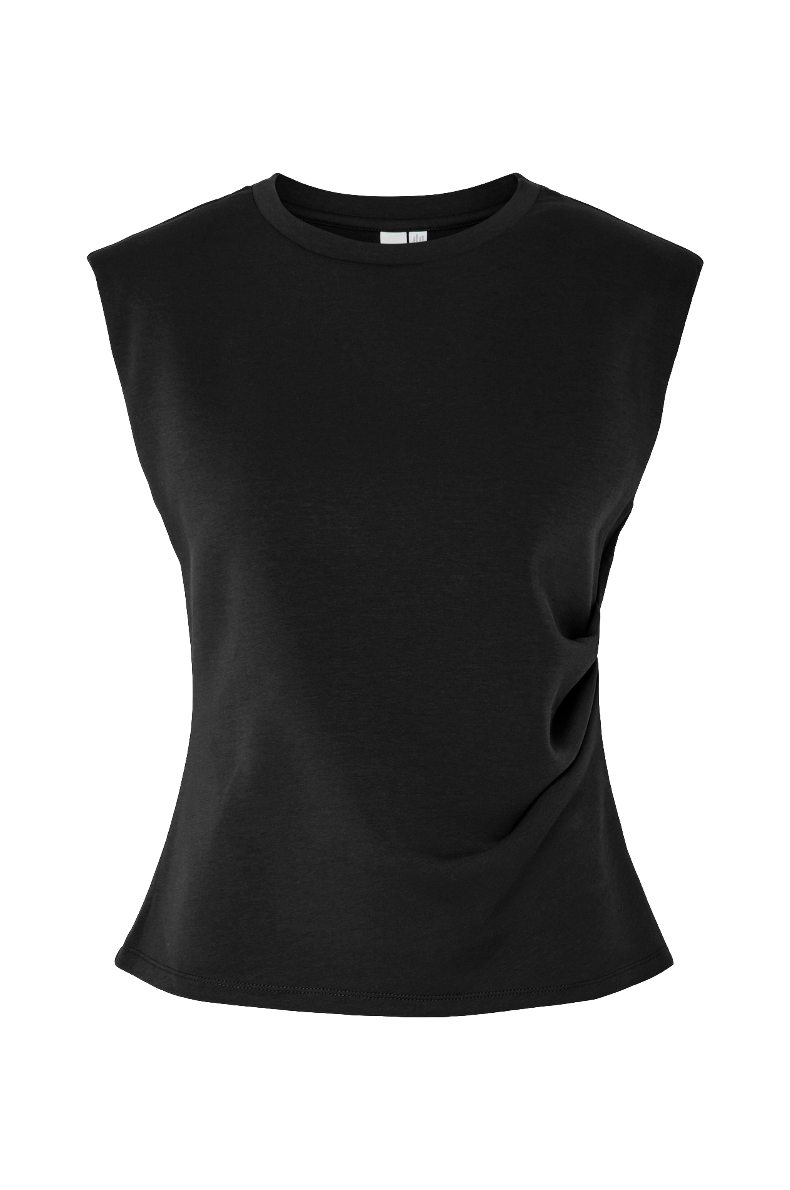 • Ermløs, stretchy topp med skulderputer• Figurformet modell• Rund hals• Rysje i ene siden