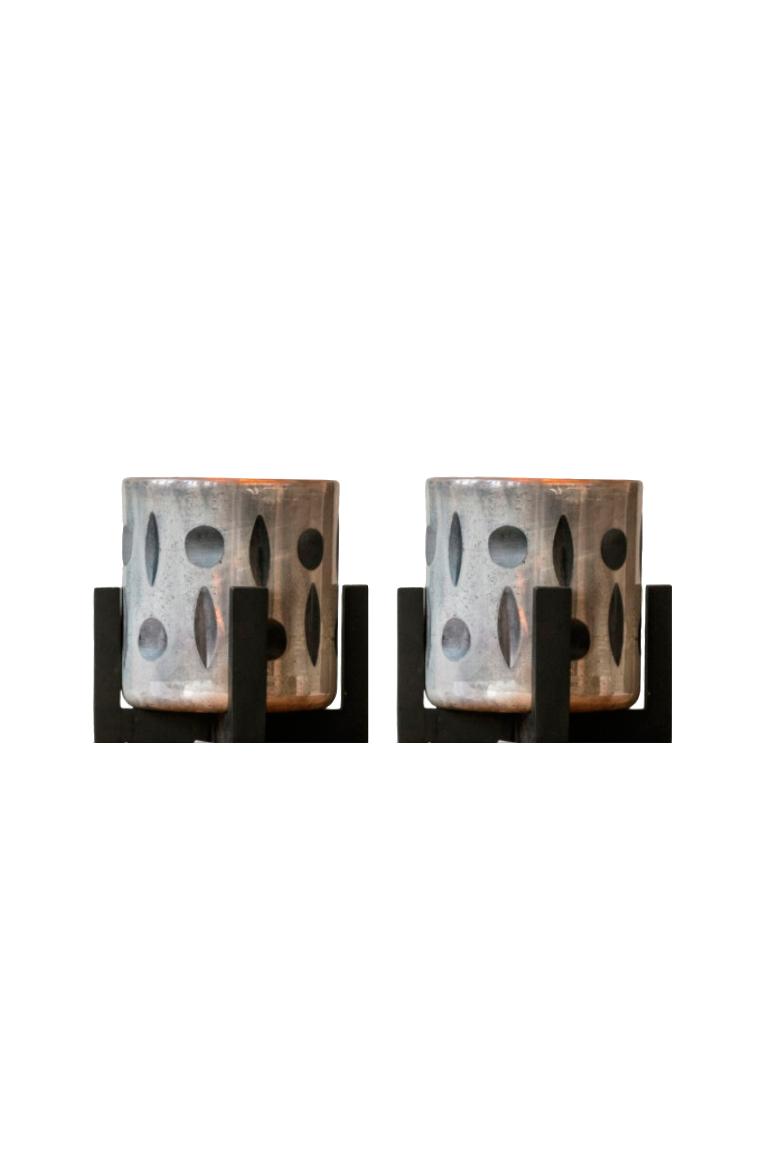Vakre lysestaker i kunstglass i et håndlaget stativ av tre. Gir en varm og koselig glød.