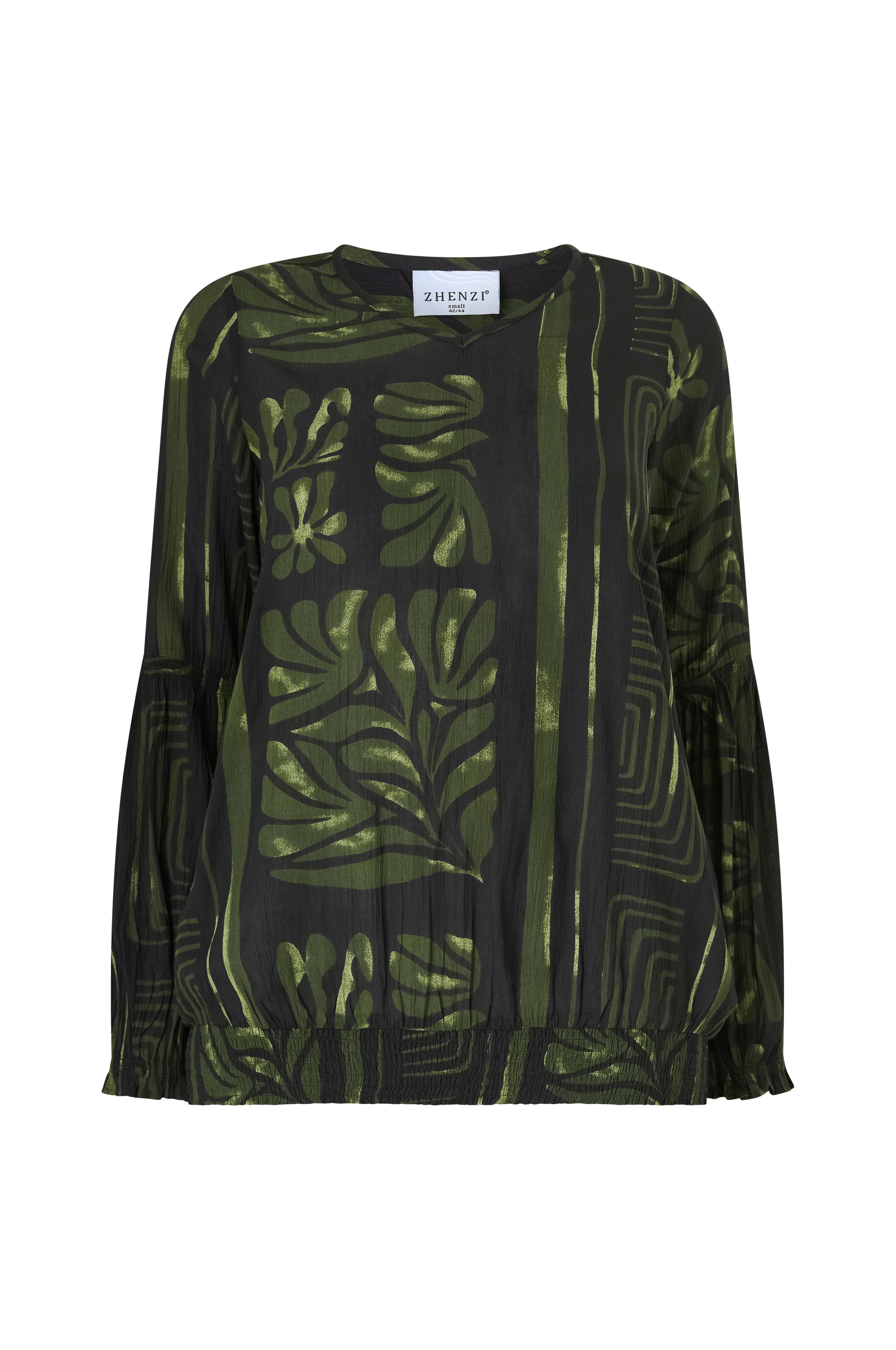 • Langermet, mønstret bluse i viskose• V-formet hals• Vaffelsøm i ermeslutten og på bunnen• Pluss-størrelser