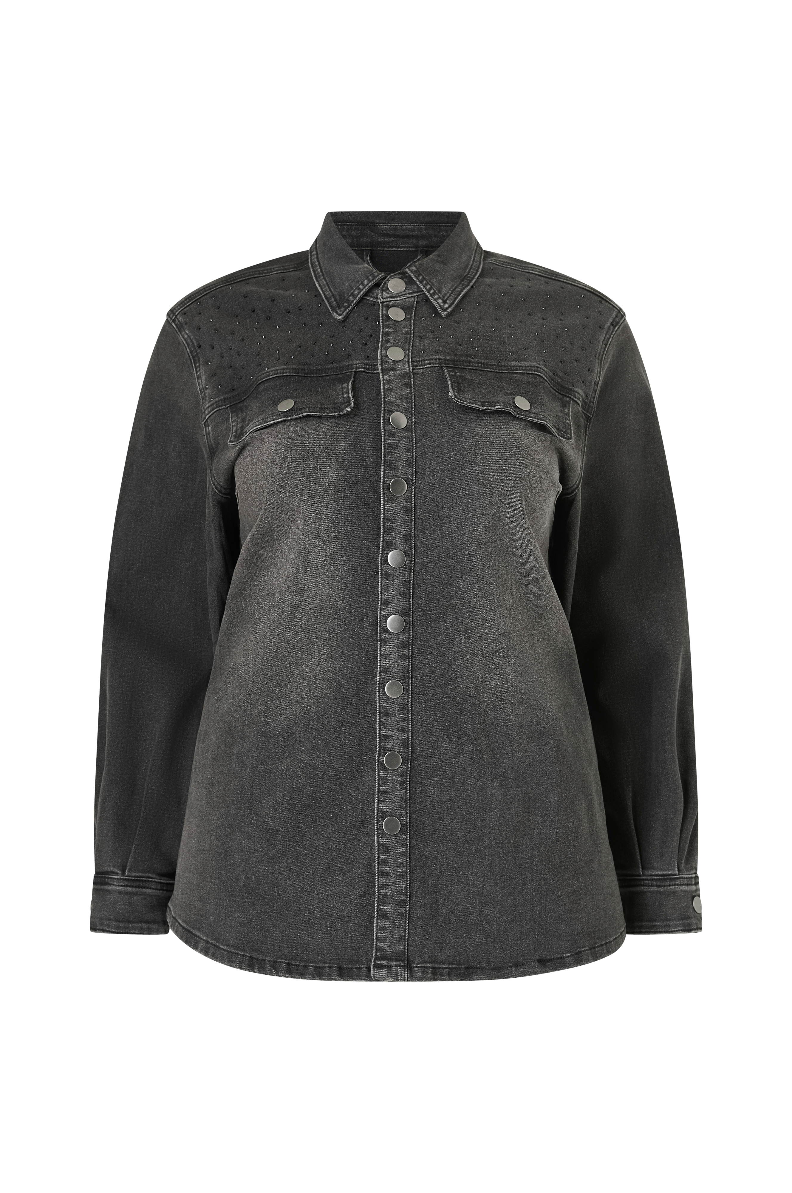 • Langermet denimskjorte i stretch denim• Rhinstener oppover foran• Jukselommer med lokk på brystet• Trykknapper foran• Avrundet hem• Pluss-størrelser