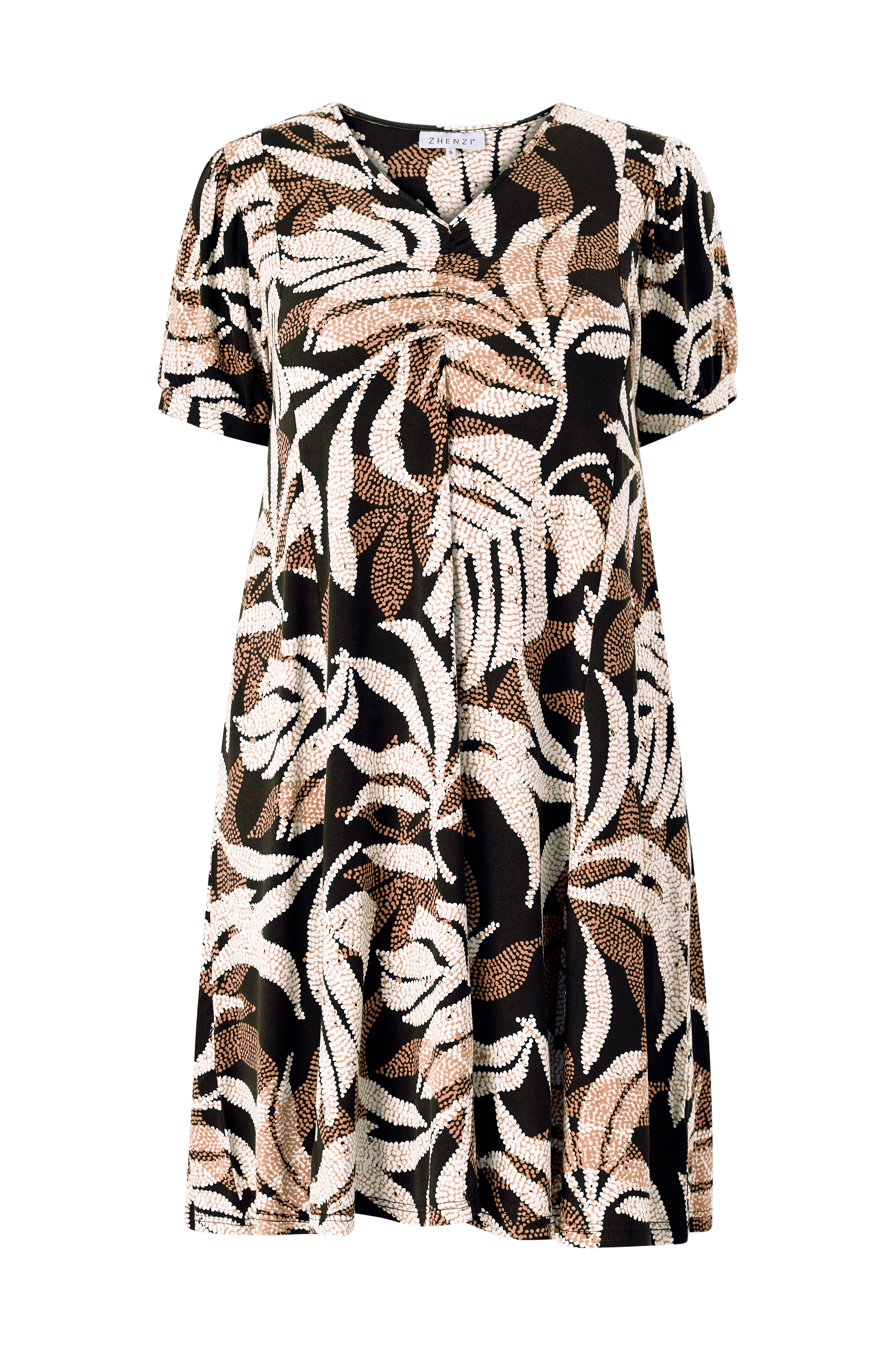 • Mønstret kjole i viskose jersey• V-hals snitt med rysje• Korte ermer• Plusstørrelser• Lengde: 103 cm i størrelse S
