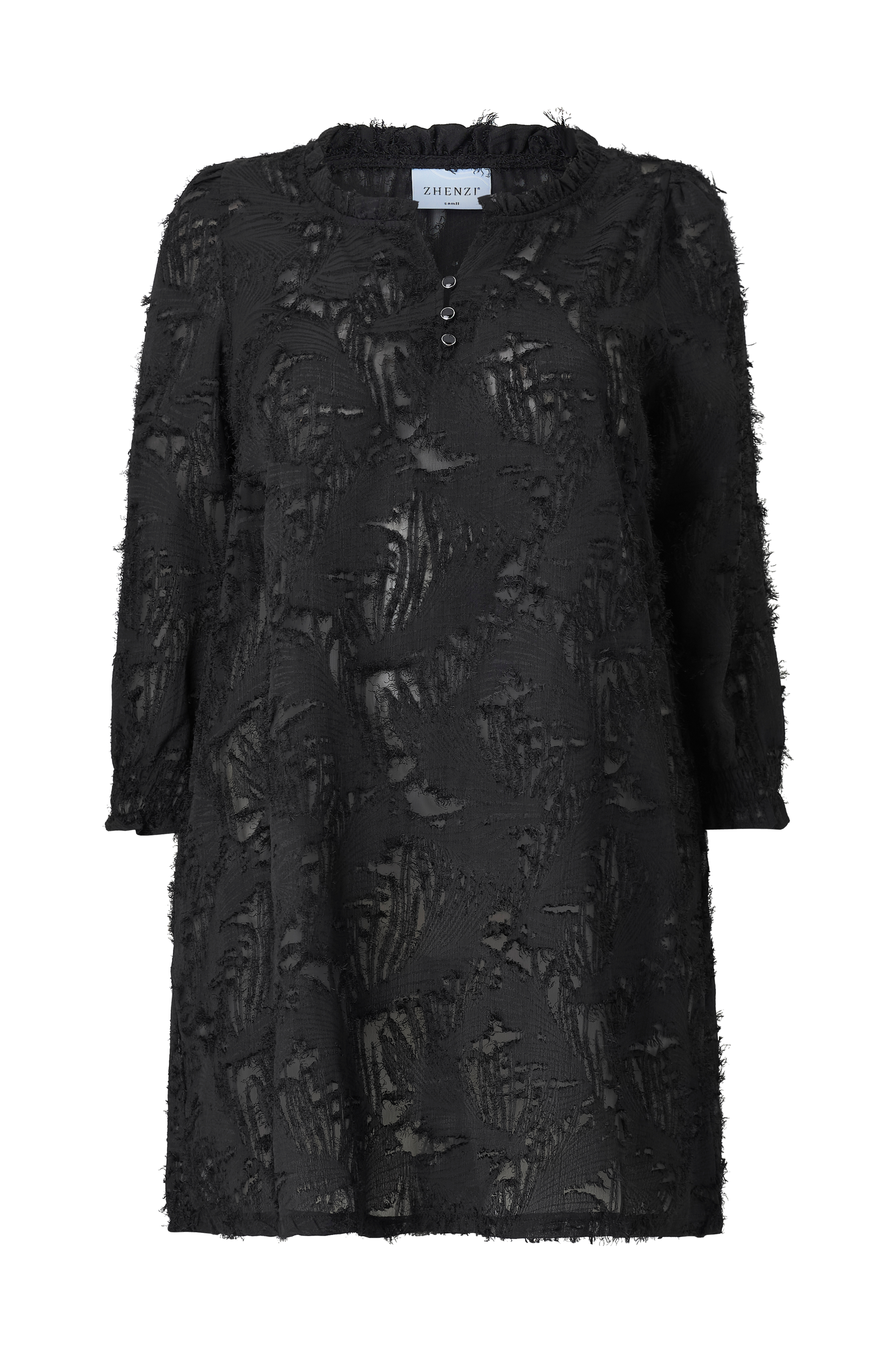 • Semitransparent tunika med frynsedetaljer• Rund hals med volangkrage og skjær• Tre knapper på halslinjen• Ermer 3/4 lang med vaffelsøm i ermeslutten• Pluss-størrelser• Lengde: 97 cm i størrelse S