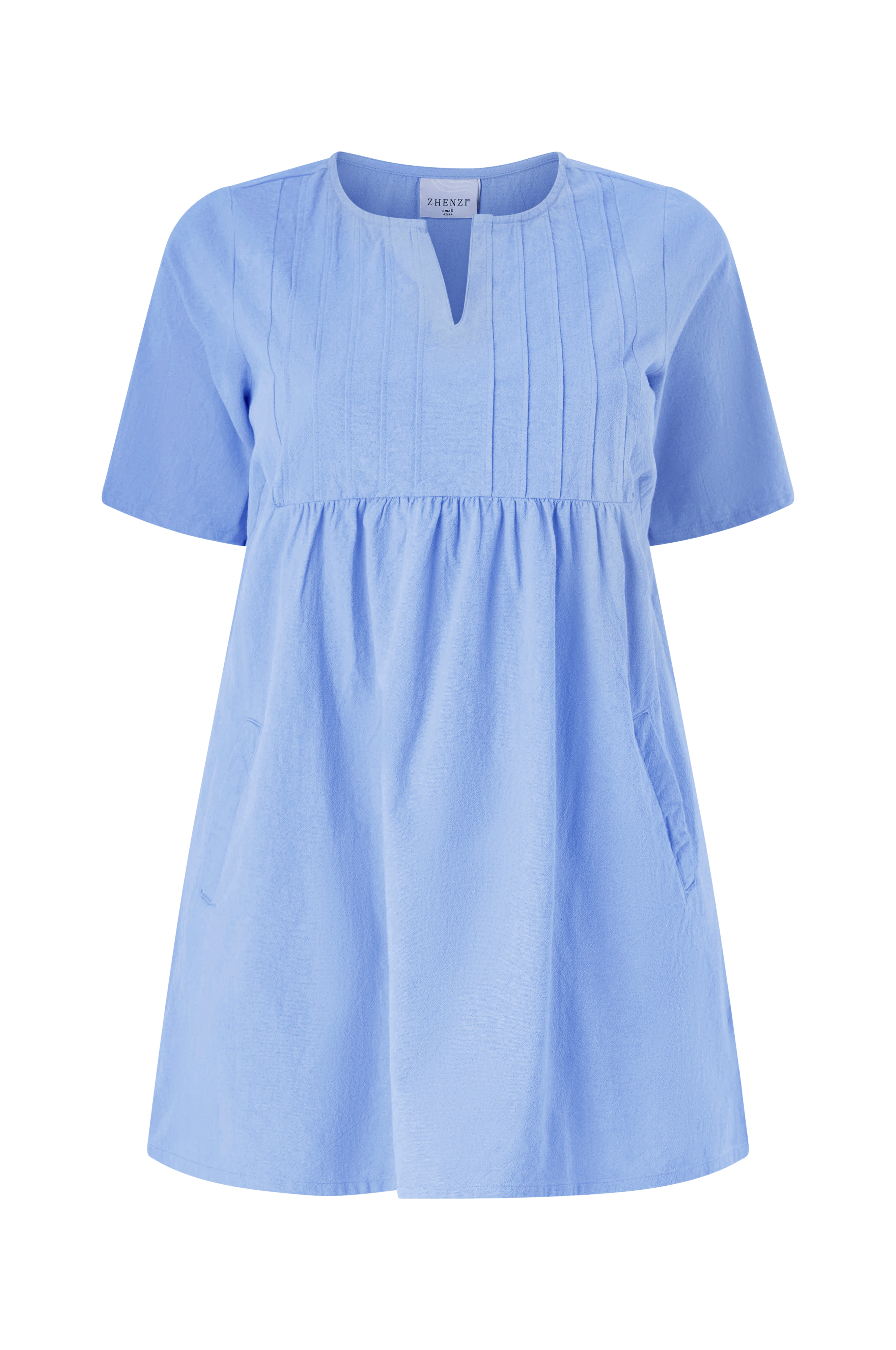 • Tunika med sidelommer• Rund hals• Skjær foran• Korte ermer• Sydd folder oppover foran• Plissé detalj ved midjen• Plusstørrelser• Lengde: 86 cm i størrelse S