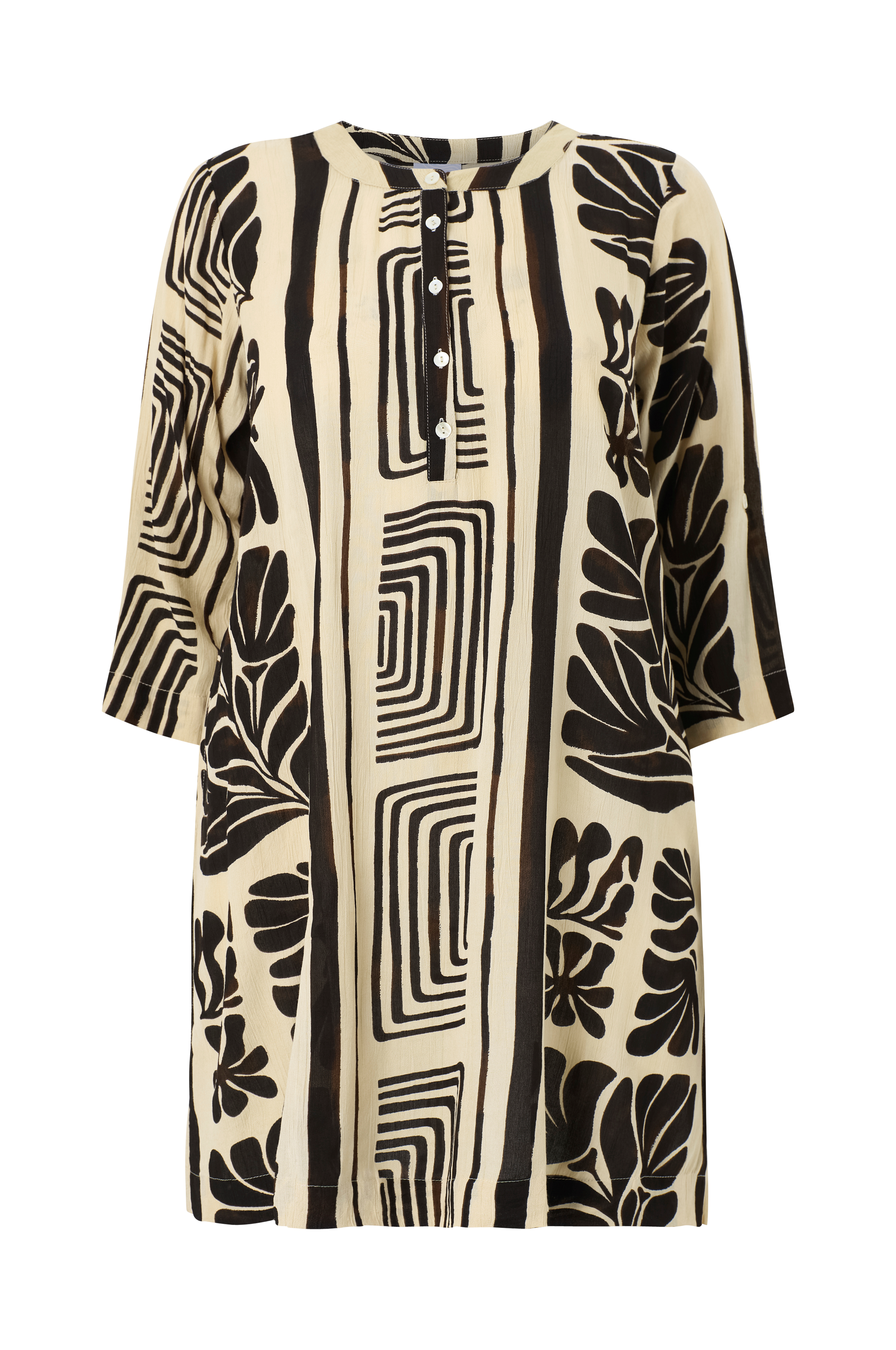 • Mønstret tunika i viskose• Rund hals• Oppbrettbare ermer 3/4 lang• Kort frontknepping• Sidelommer• Pluss-størrelser• Lengde: 94 cm i størrelse S