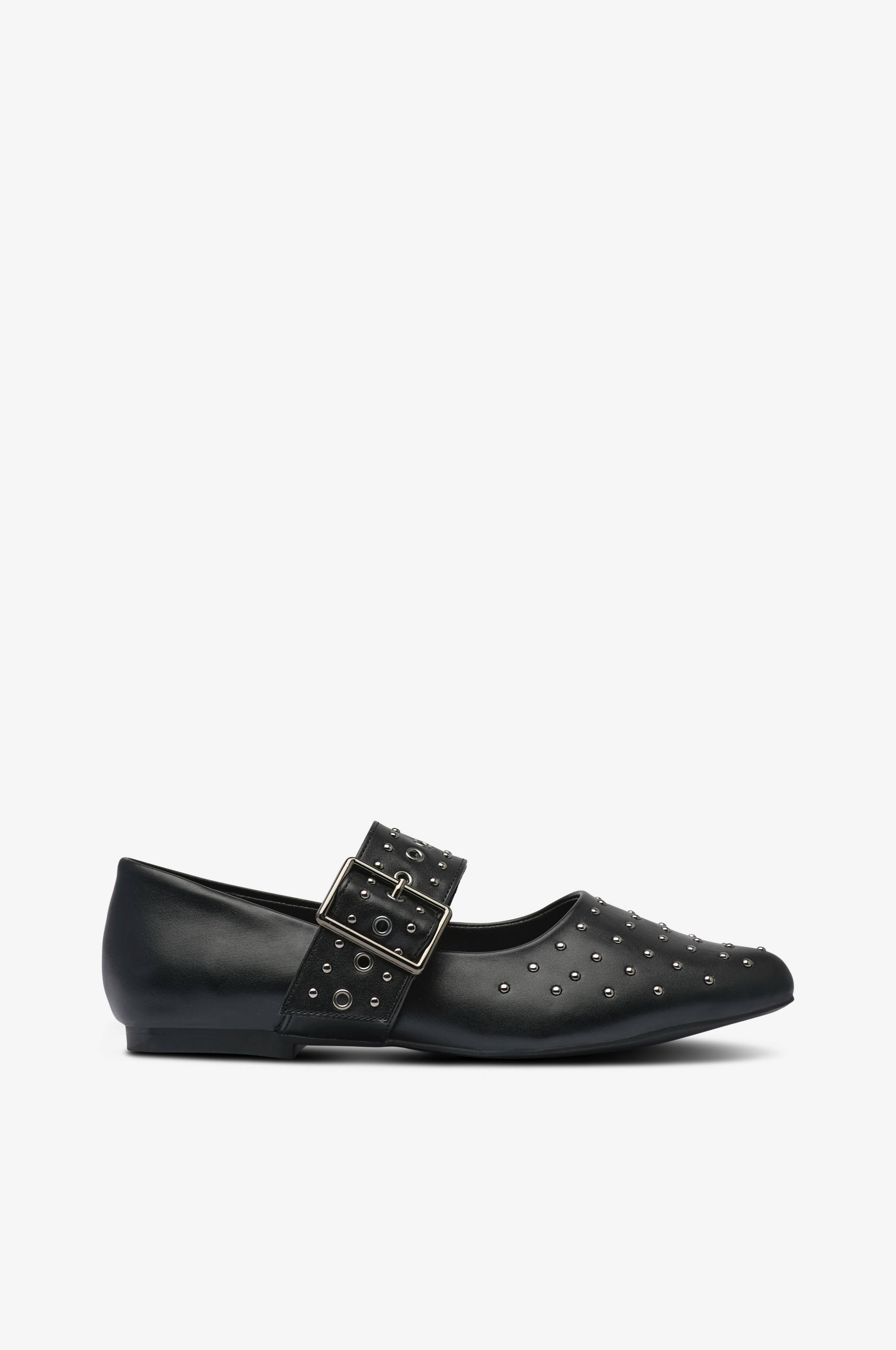 • Ballerinasko i skinnimitasjon med runde stifter• Bred passform• Spiss tåform• Justerbar, bred stropp over foten• Mykstoppet innersåle