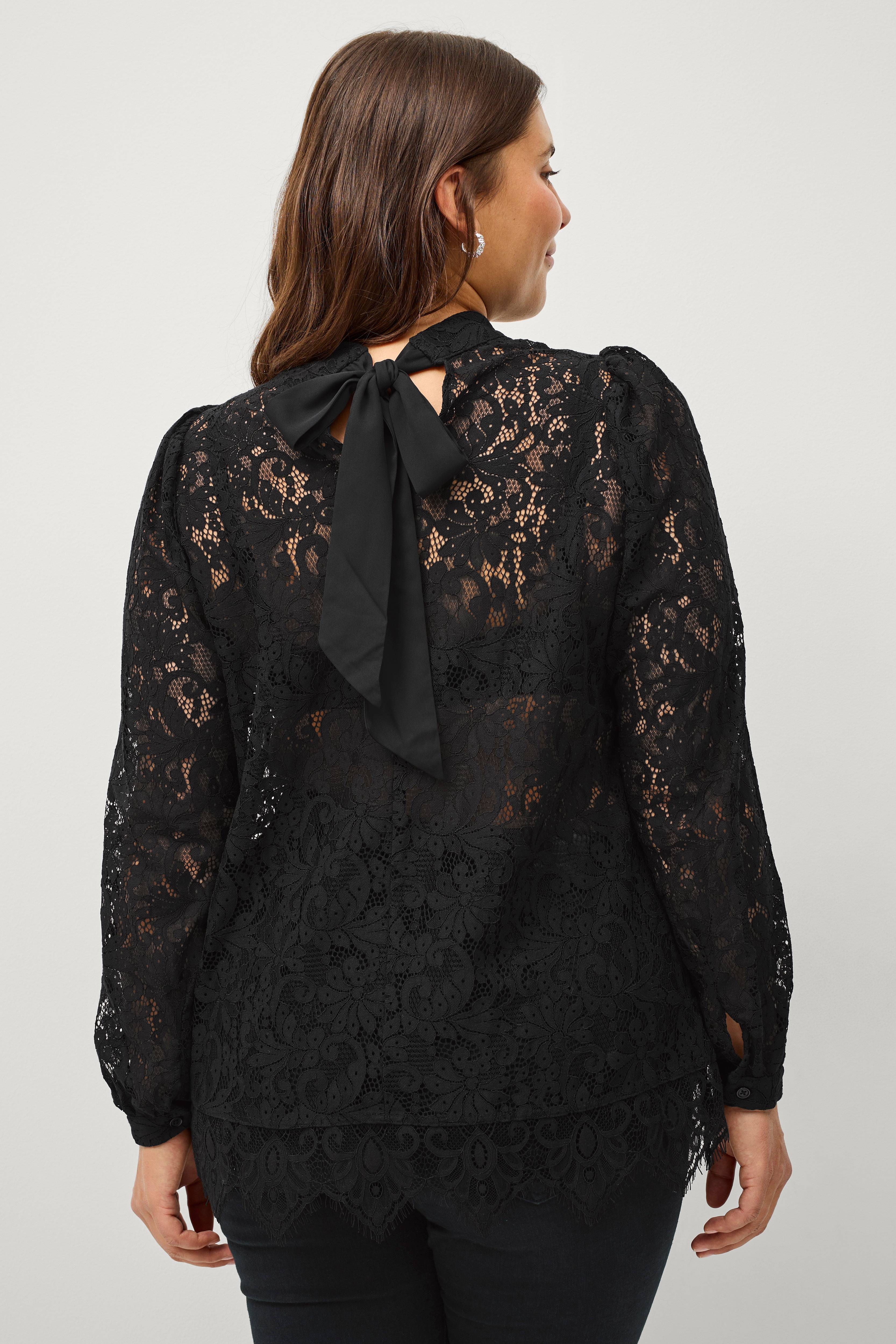 • Blondebluse med høy hals• Knytbar tråd oppover ryggen• Lange ermer• Ventilasjon med knapp i ermeslutten• Plusstørrelser• Ufôret