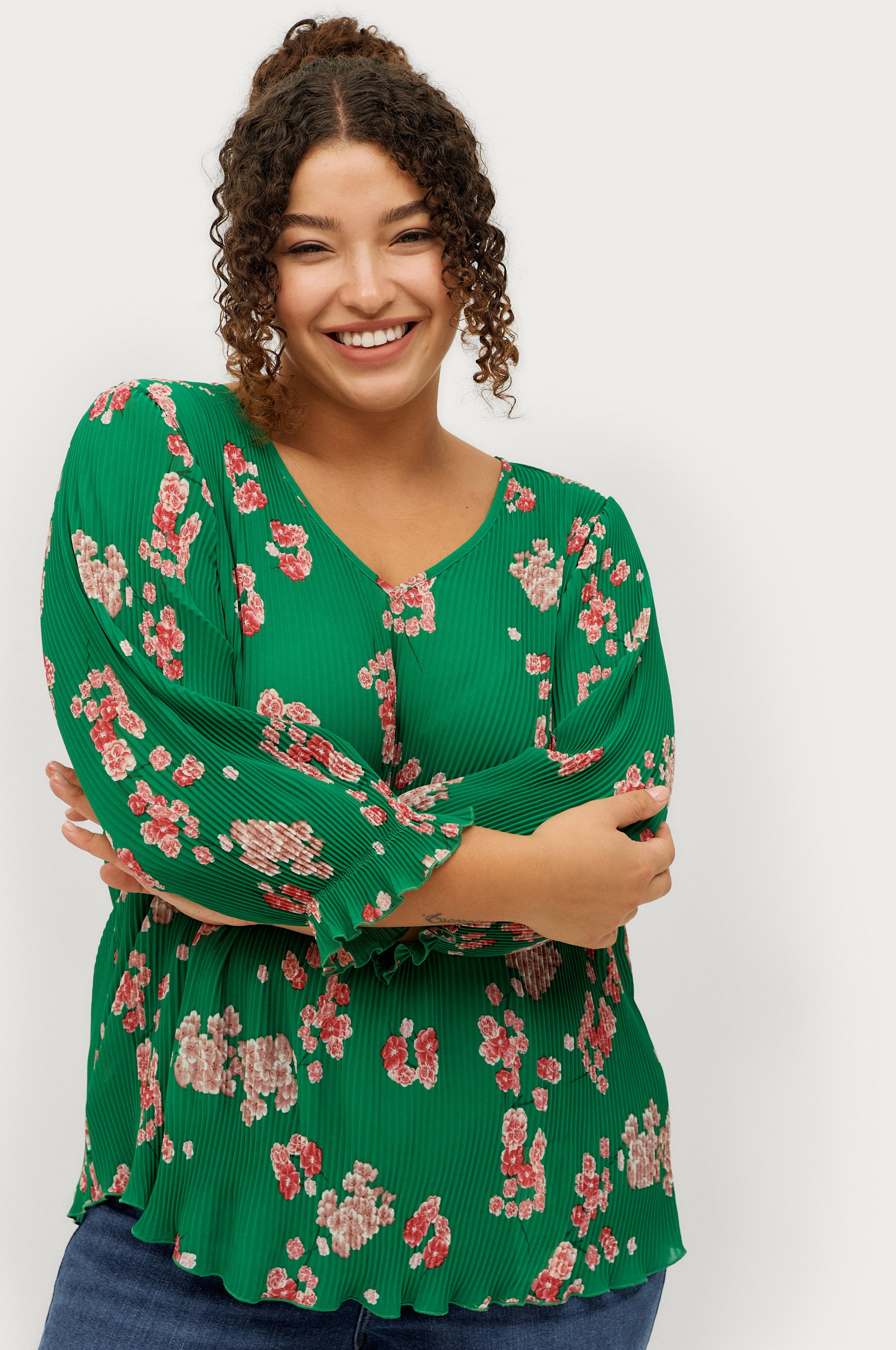 • Plissertt design• V-formet hals• Armer 3/4 lang med volangkant• Plusstørrelser