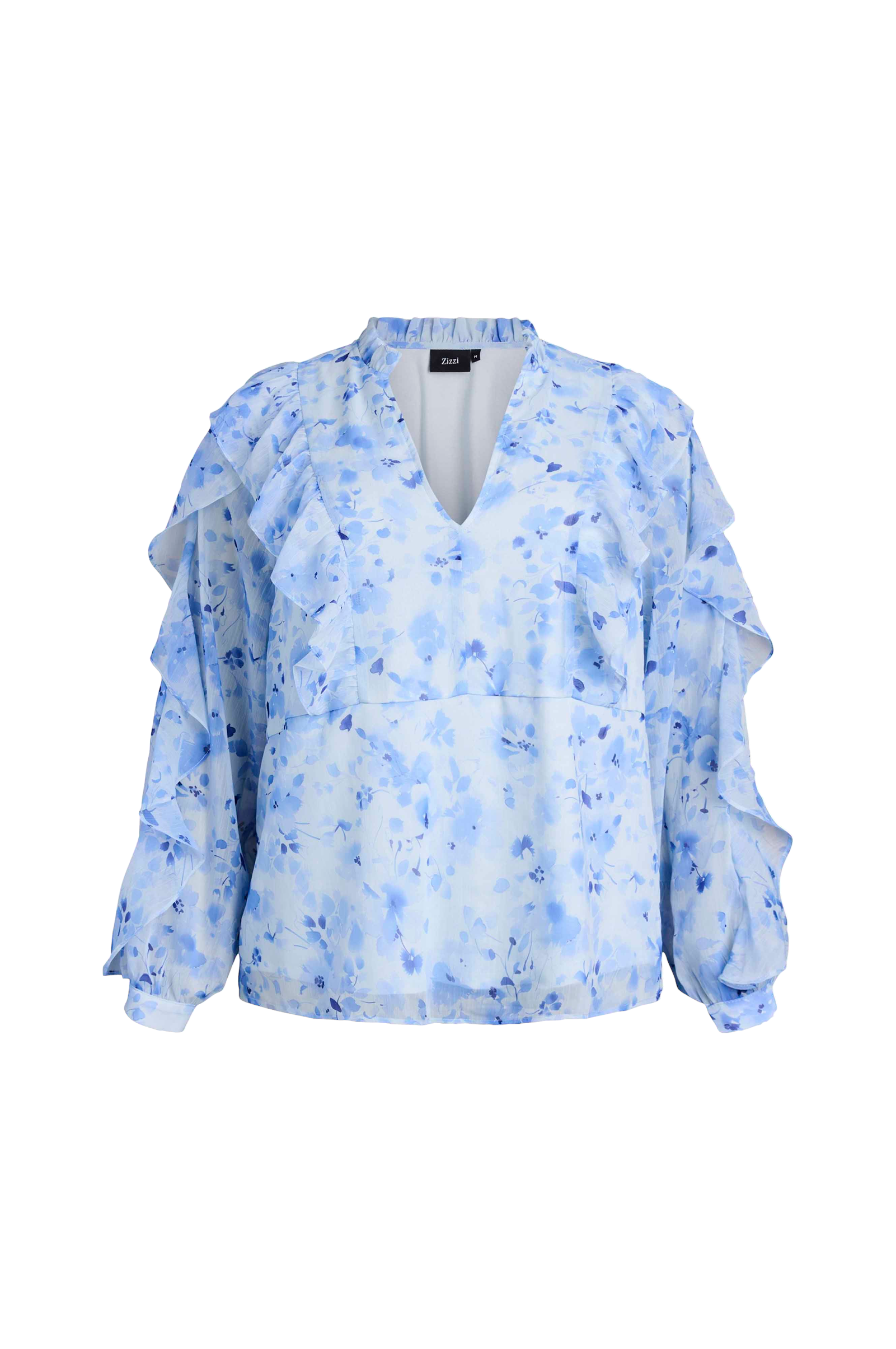 • Fôret bluse i chiffon• V-formet hals med volangkant• Korte draperte volangermer med volanger over skuldrene• Elastisk utskjæring ved midjen• Pluss-størrelser