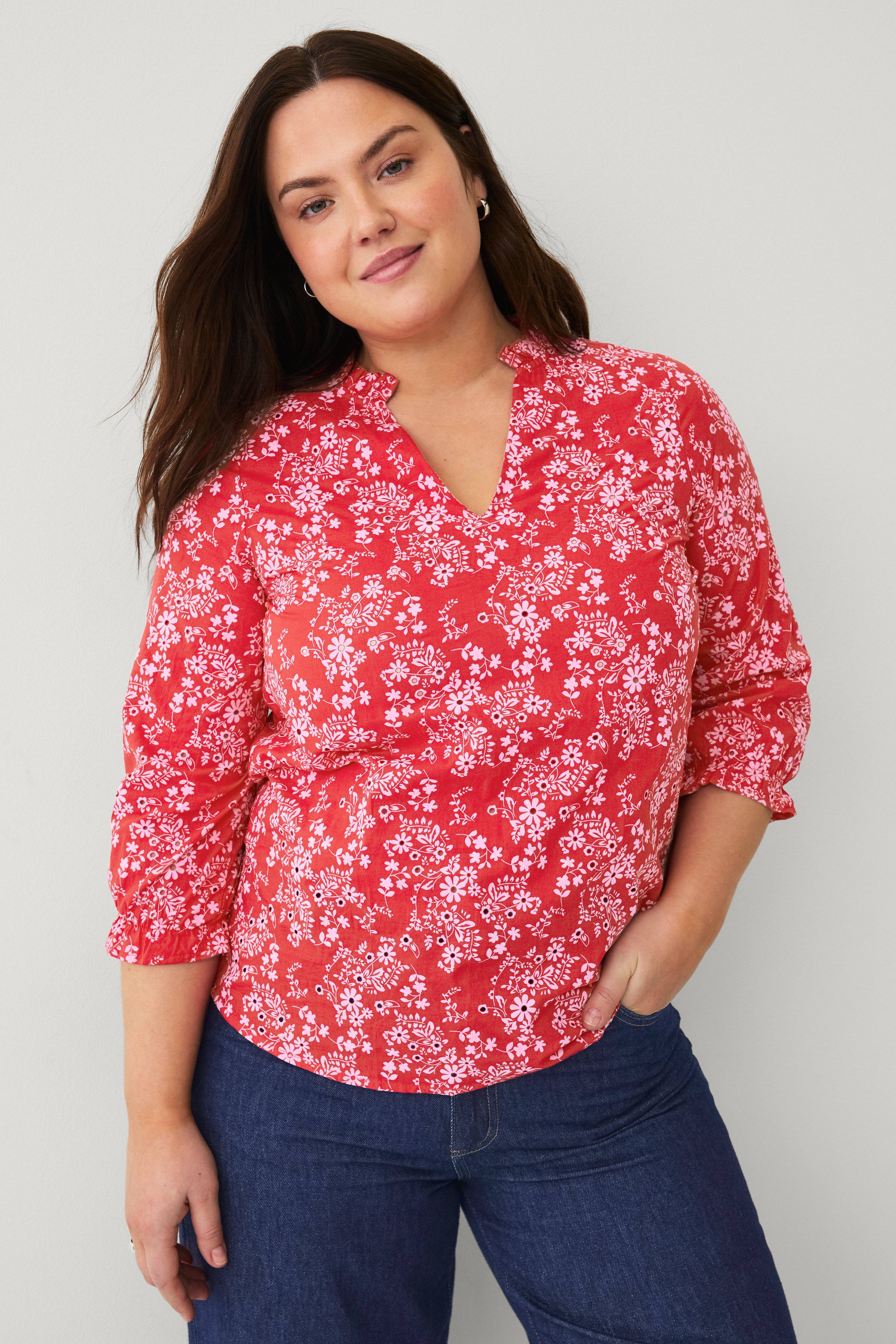 • Plusstørrelser• Rett modell• Rund hals med liten volang og ventilasjon foran• Erme 3/4 lang med elastisk søm på bunnen
