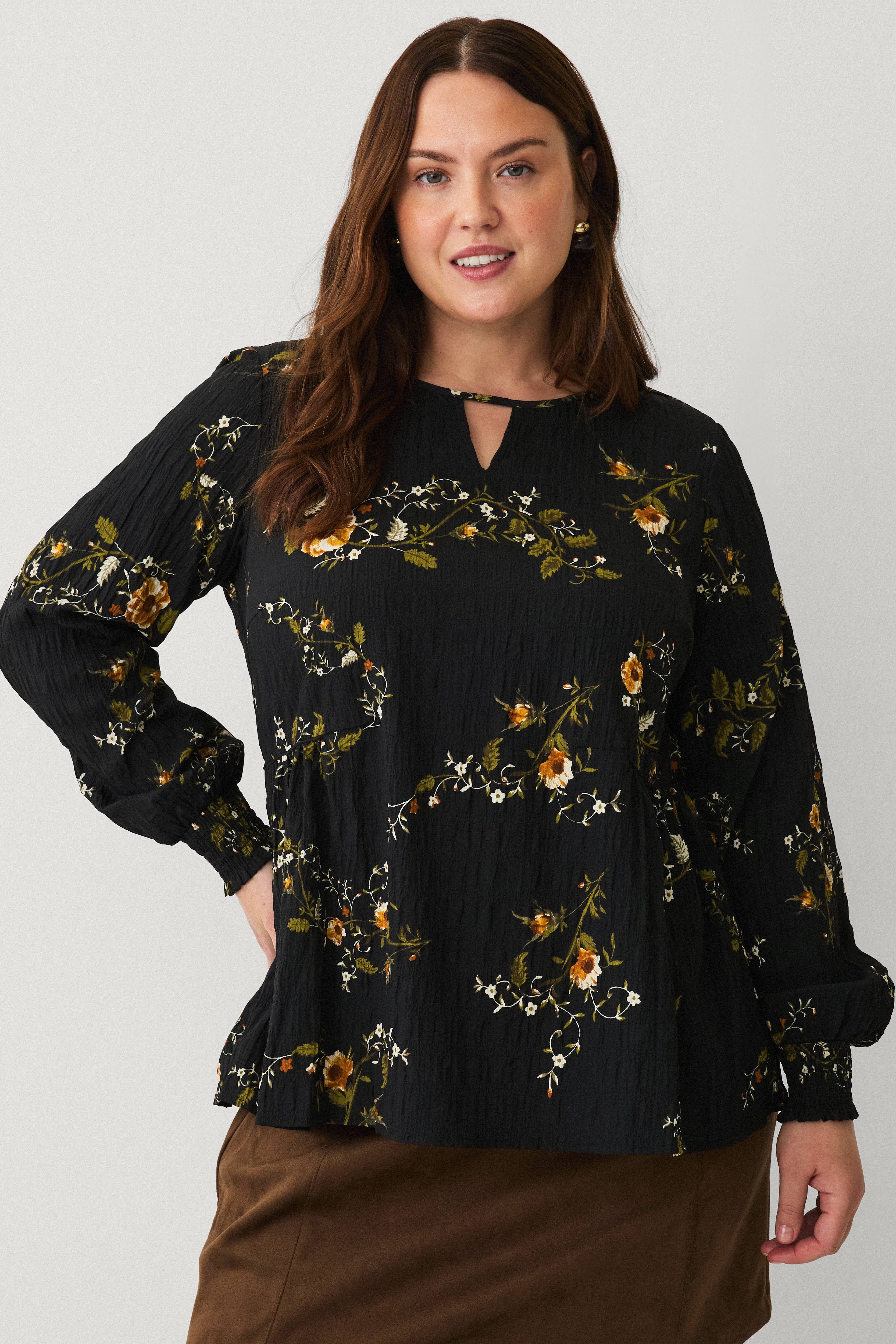 • Plusstørrelser• Utsvingt modell i krepp• Hals med liten ventilasjon foran• Langt erme med vaffelsøm i ermeslutten• Markert midje bakpå og i sidene