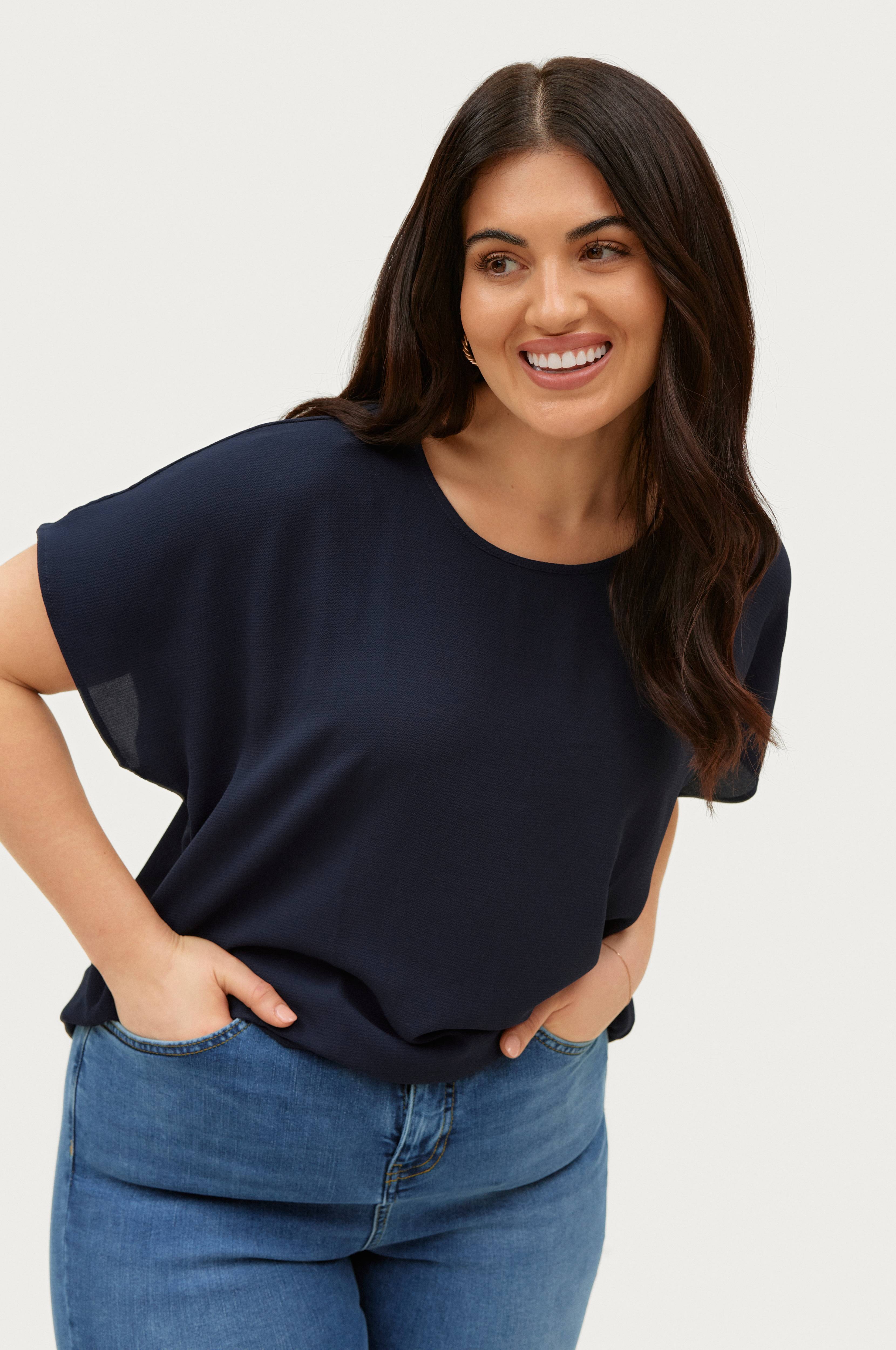 • Rund hals• Korte ermer• Avrundet hem• Kreppet kvalitet