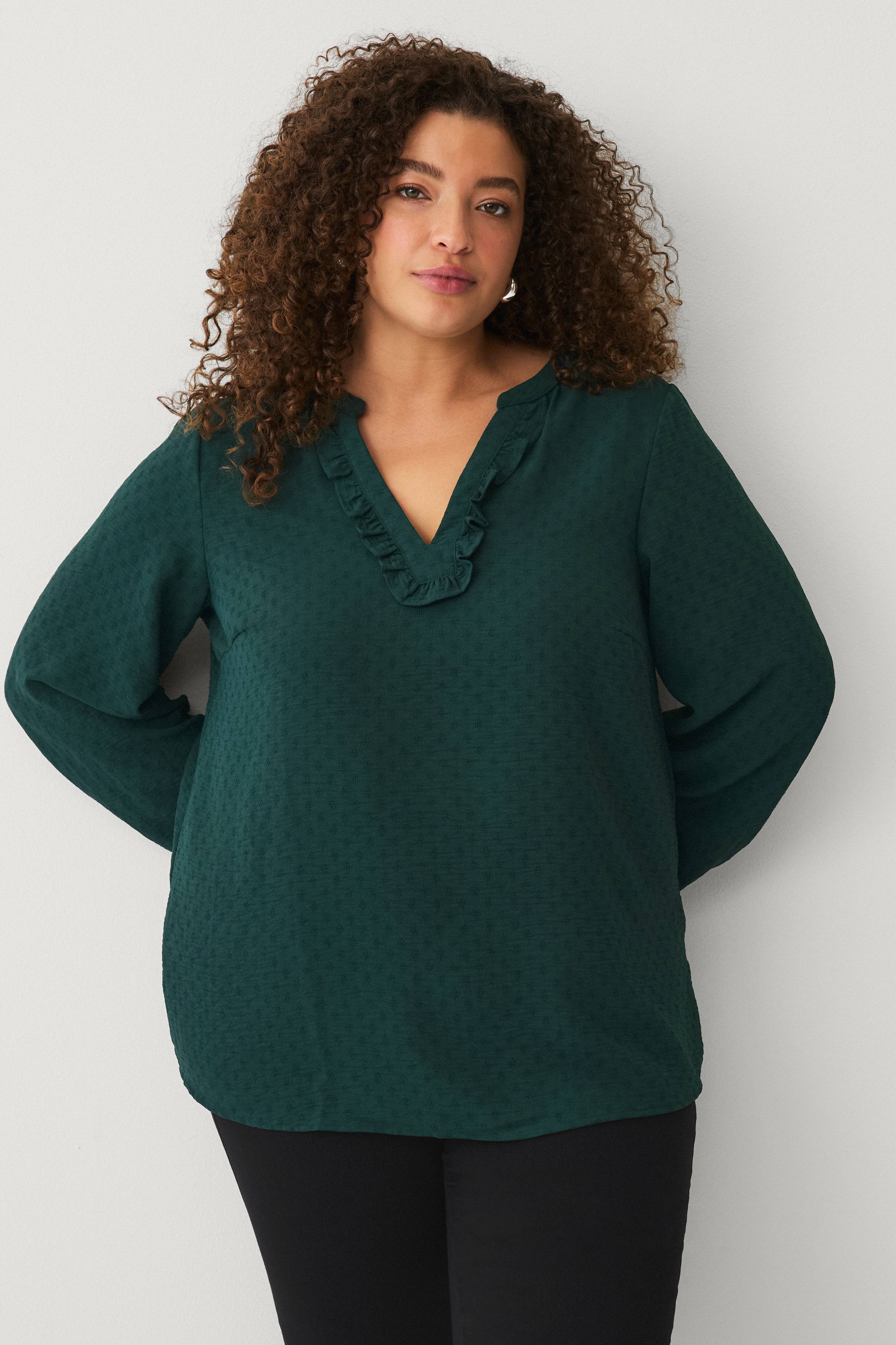 • Plusstørrelser• Uformell, strukturmønstret modell• Hals med ventilasjon og volangkant foran• Langt erme