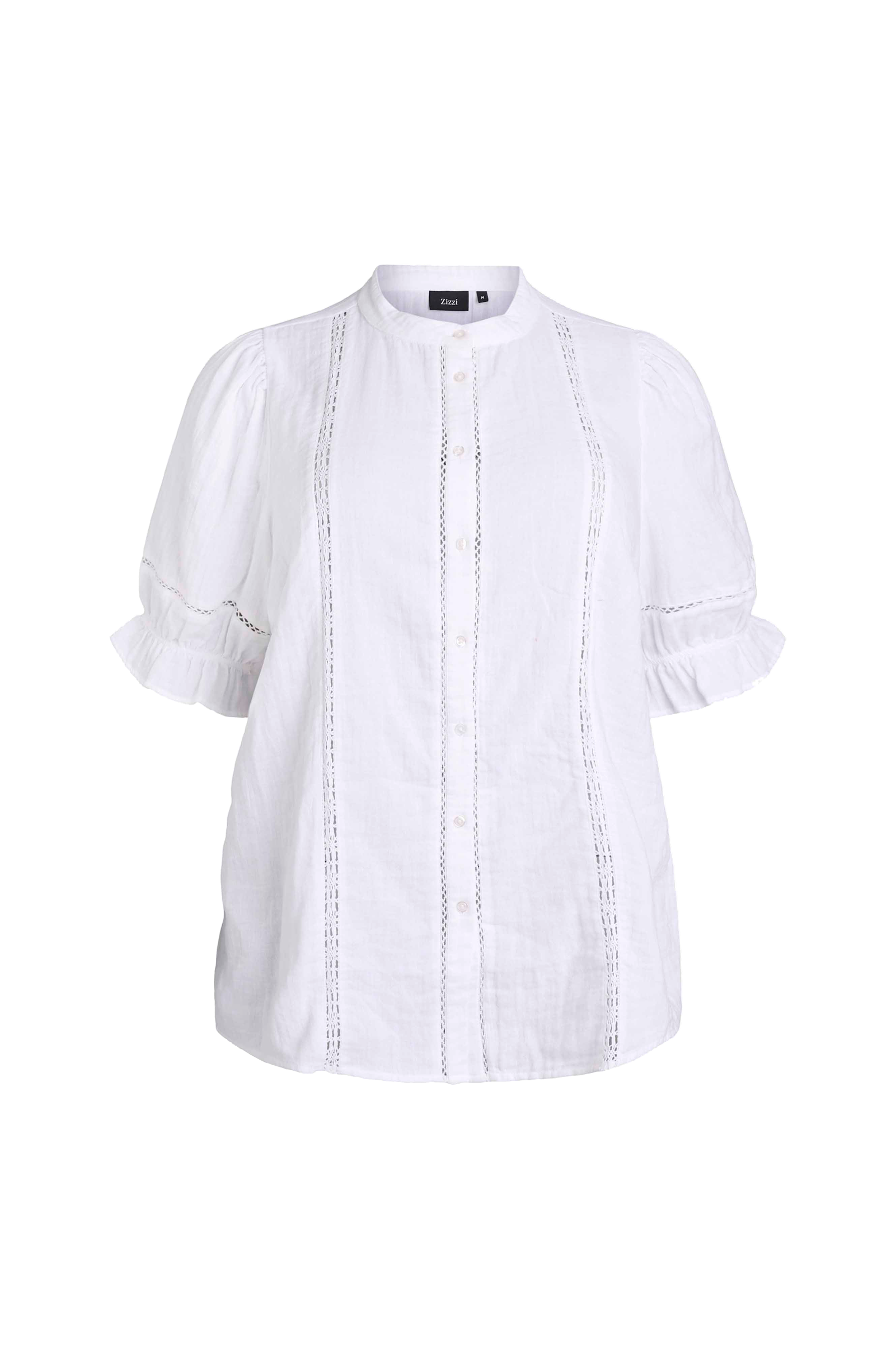 • Myk bluse i bomullsmuslin• Rund hals• Knapper hele veien fram• Halvlange puffermer med elastiske volanger i ermeslutten• Hullbroderier foran og rundt ermene• Pluss-størrelser