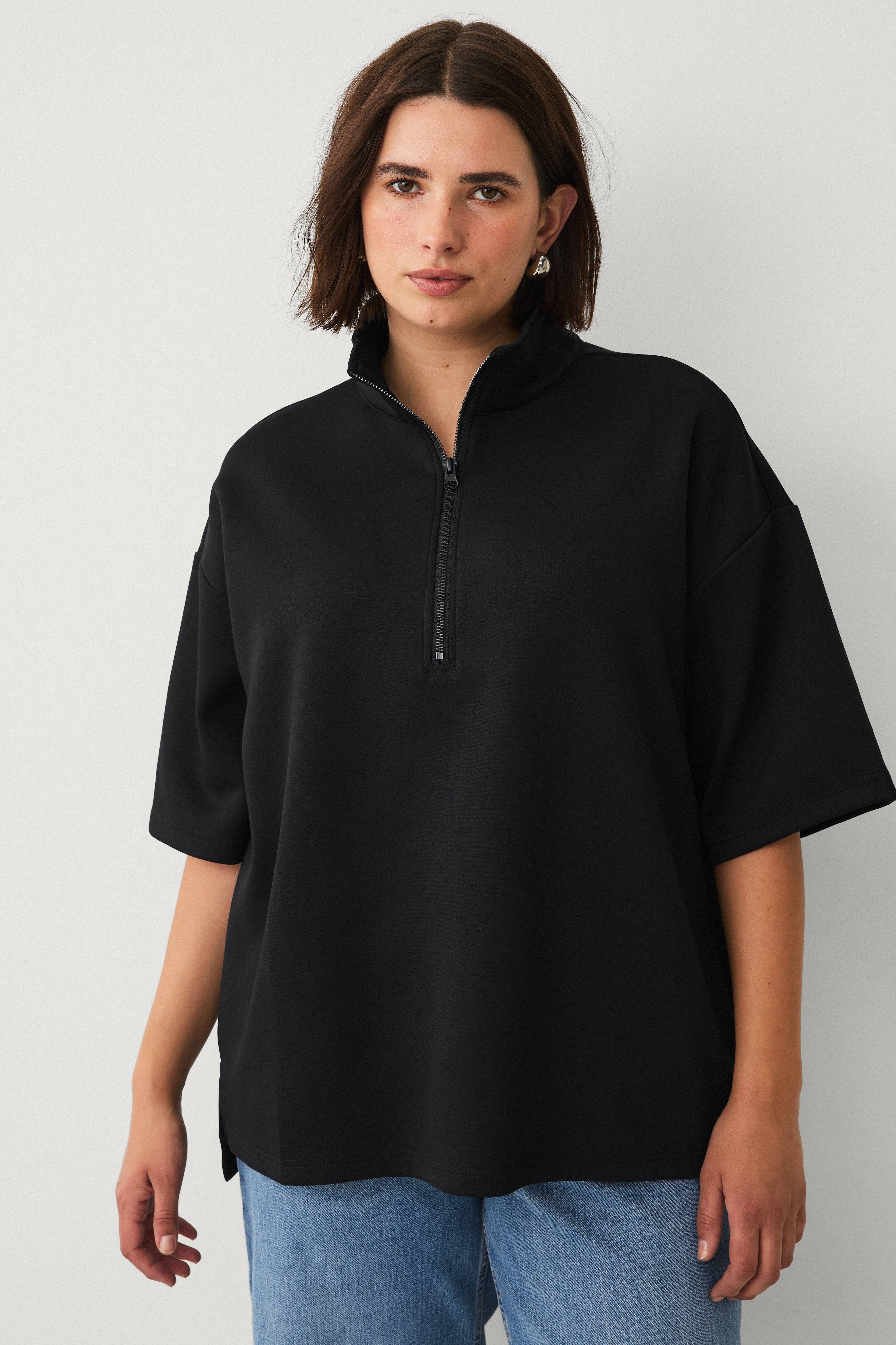 • Collegegenser med høy krage og halvlang glidelås• Halvlange ermer med utringede skuldre• Skjær nede i sidene• Litt lengre backing• Pluss-størrelser