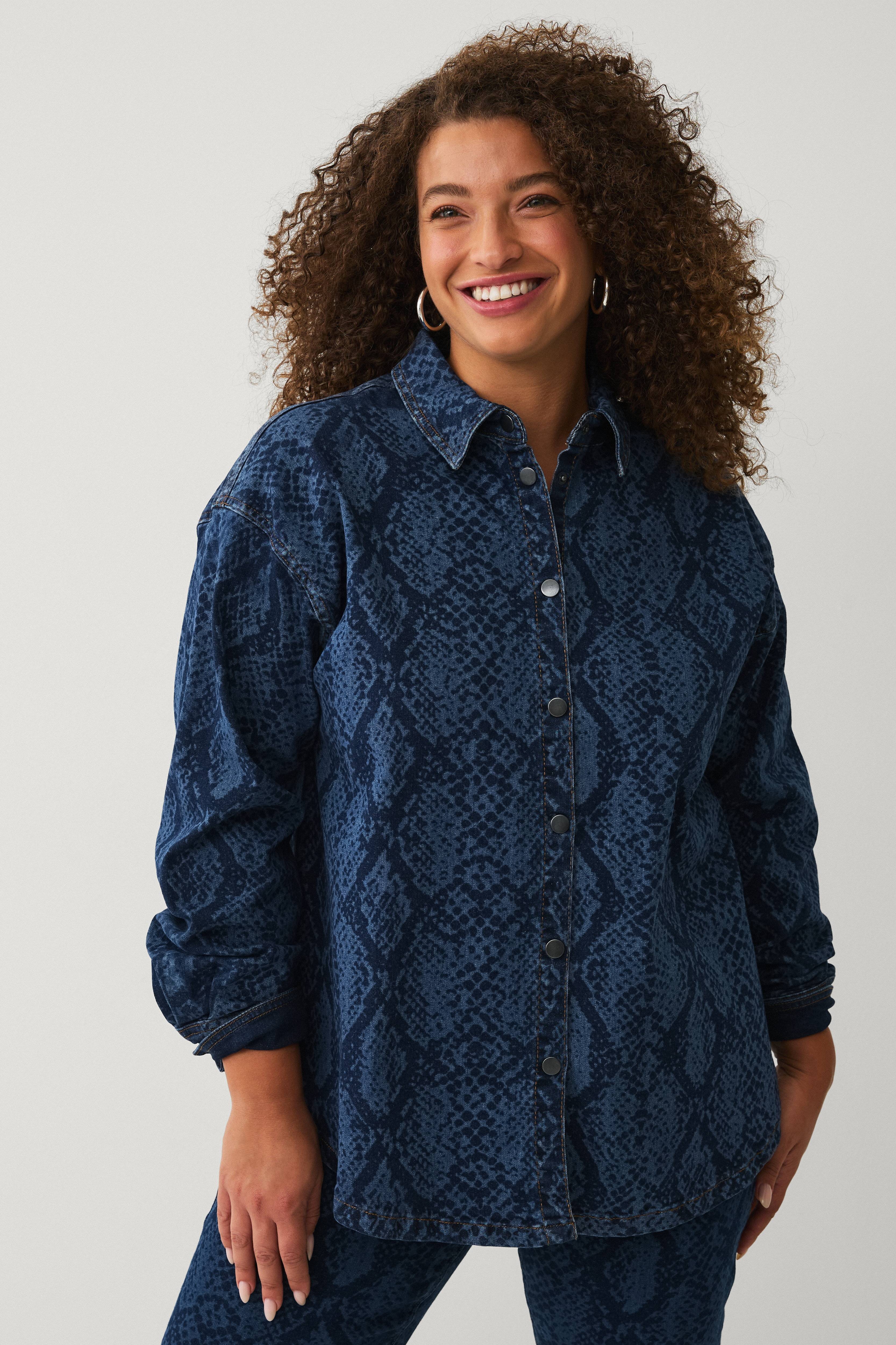 • Slangemønstret, langermet skjorte i denim• Lukning med trykknapper• Avrundet hem• Pluss-størrelser