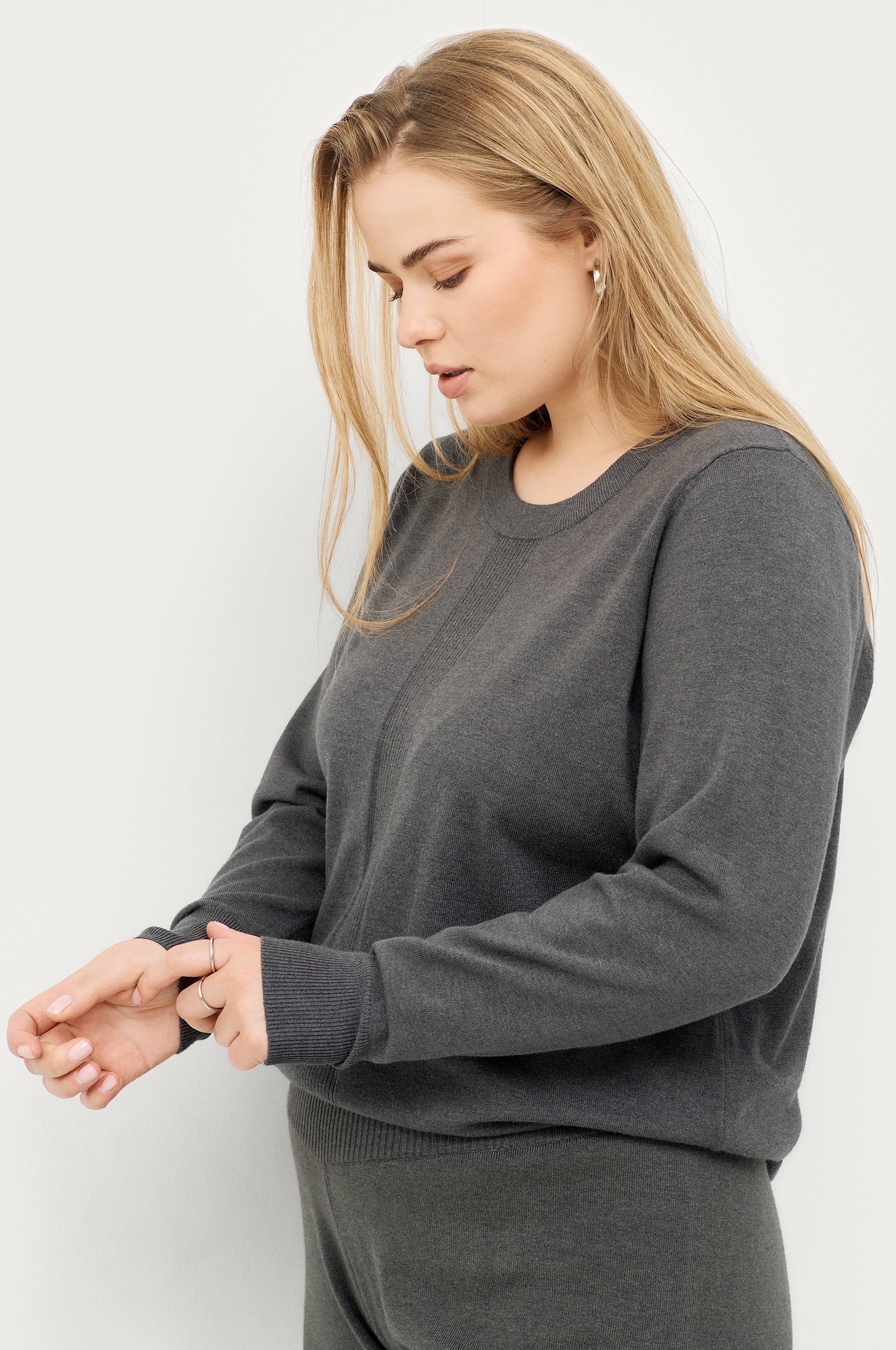 • Plusstørrelser• Finstrikket genser i viskosemiks• Ribbet panel foran• Ribbet mansjett i ermeslutten og på bunnen